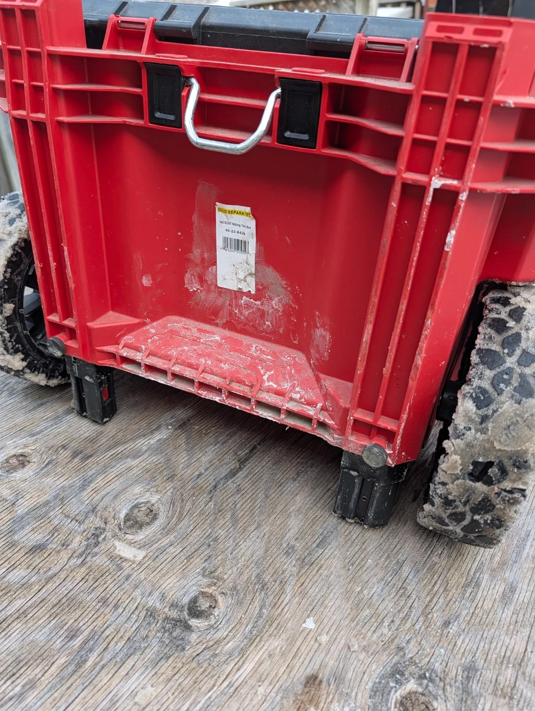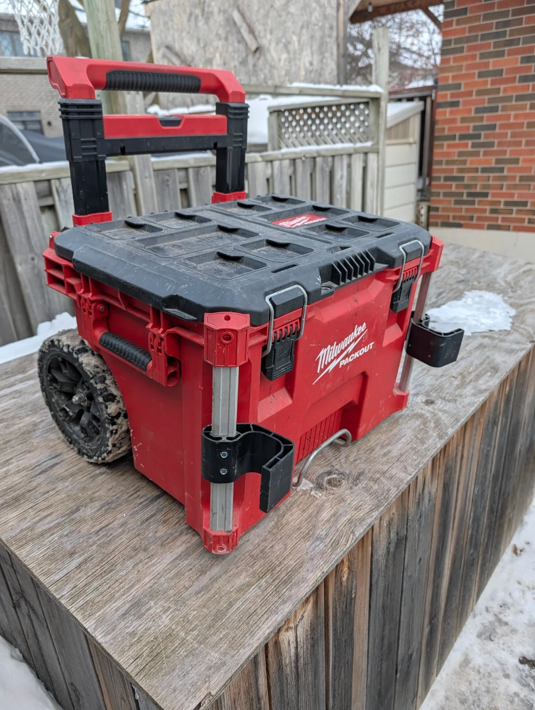 Milwaukee PACKOUT rolling tool box with telescopic handle. Heavy-duty construction for durability. Large wheels for easy transport on job sites. Perfect for storing and moving tools.