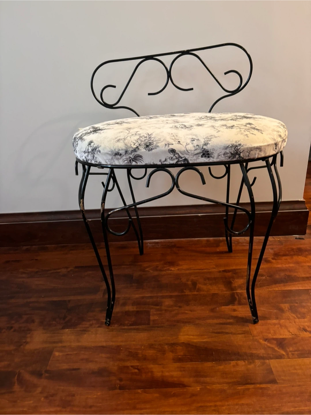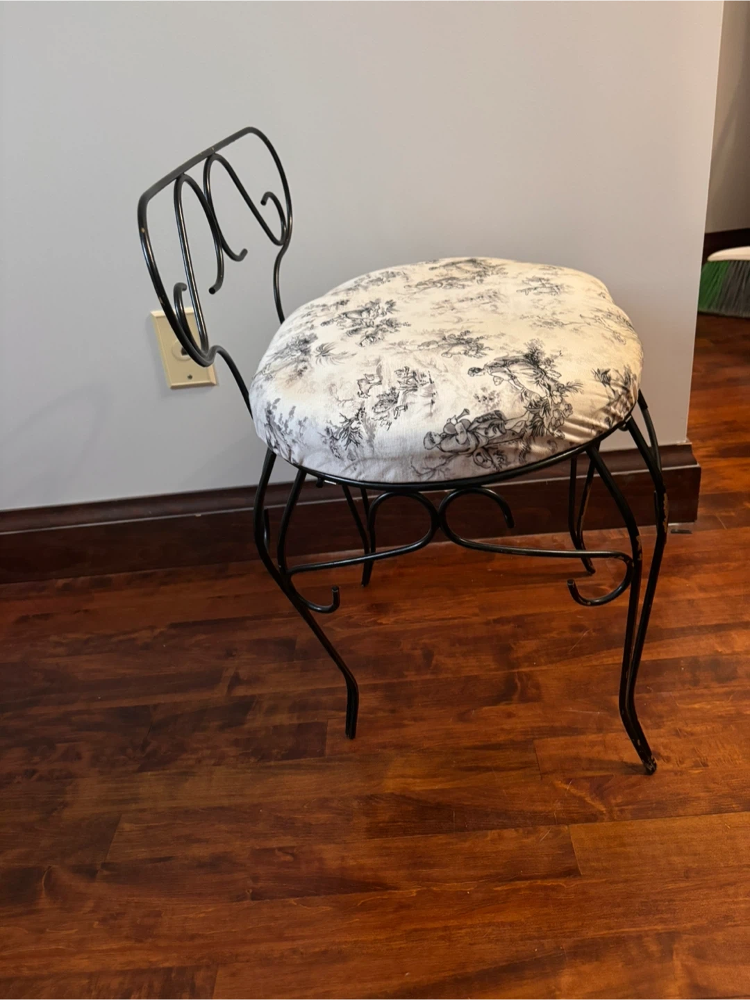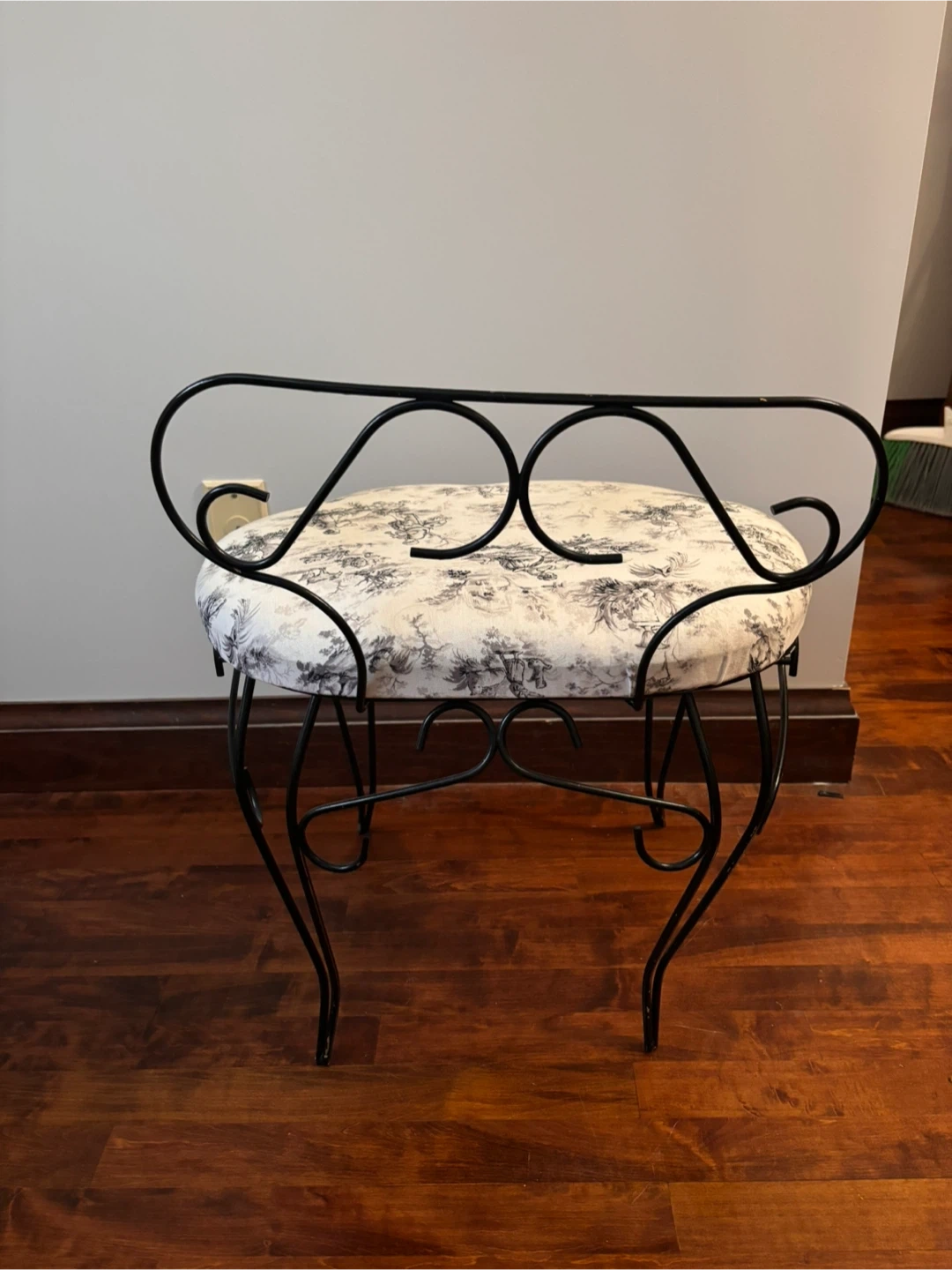 $80 or best offer - Elegant wrought-iron accent chair featuring decorative scrollwork and a toile-pattern upholstered seat. Perfect as a vanity chair, bedroom accent, or decorative seating piece.