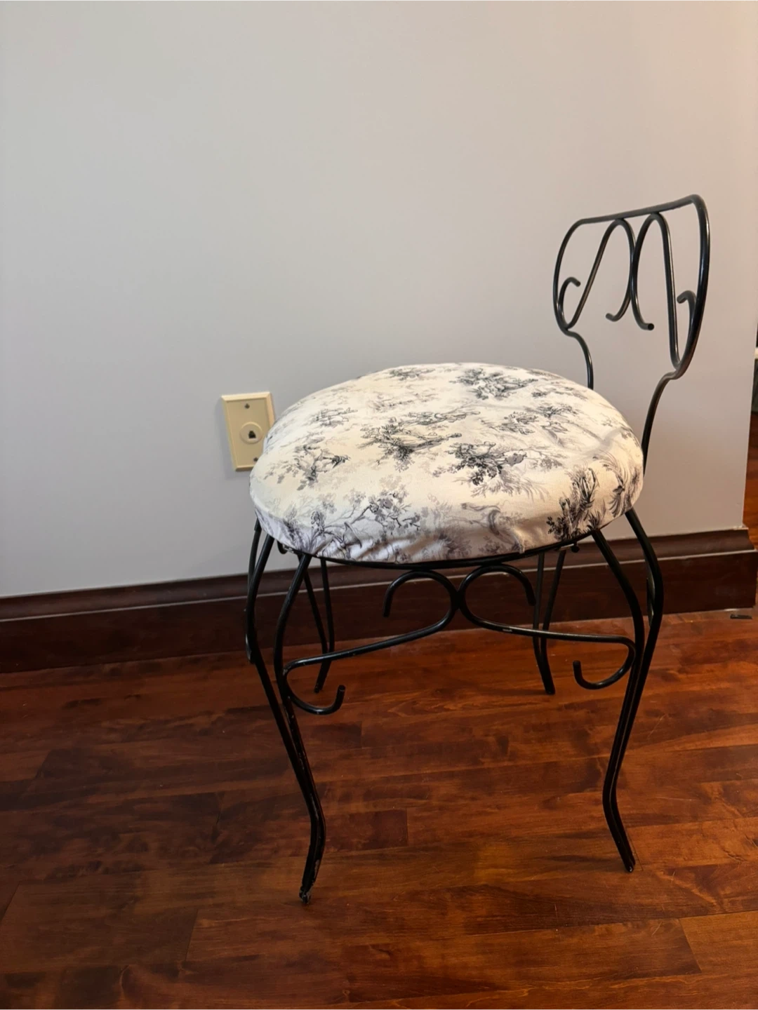 $80 or best offer - Elegant wrought-iron accent chair featuring decorative scrollwork and a toile-pattern upholstered seat. Perfect as a vanity chair, bedroom accent, or decorative seating piece.