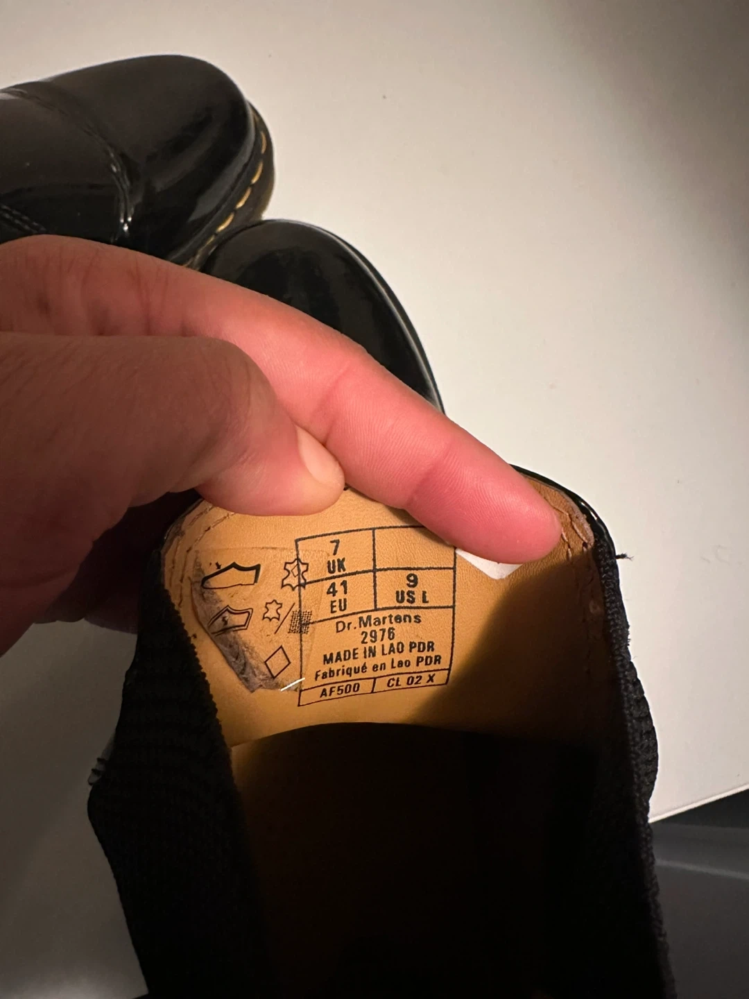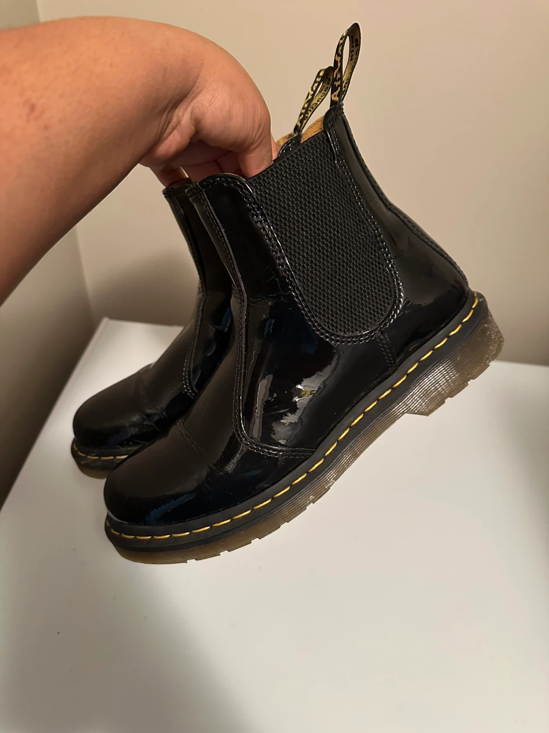 Dr. Martens 2976 Chelsea boots in a shiny black patent leather finish. Features elasticated side panels for easy on and off. Made in England.