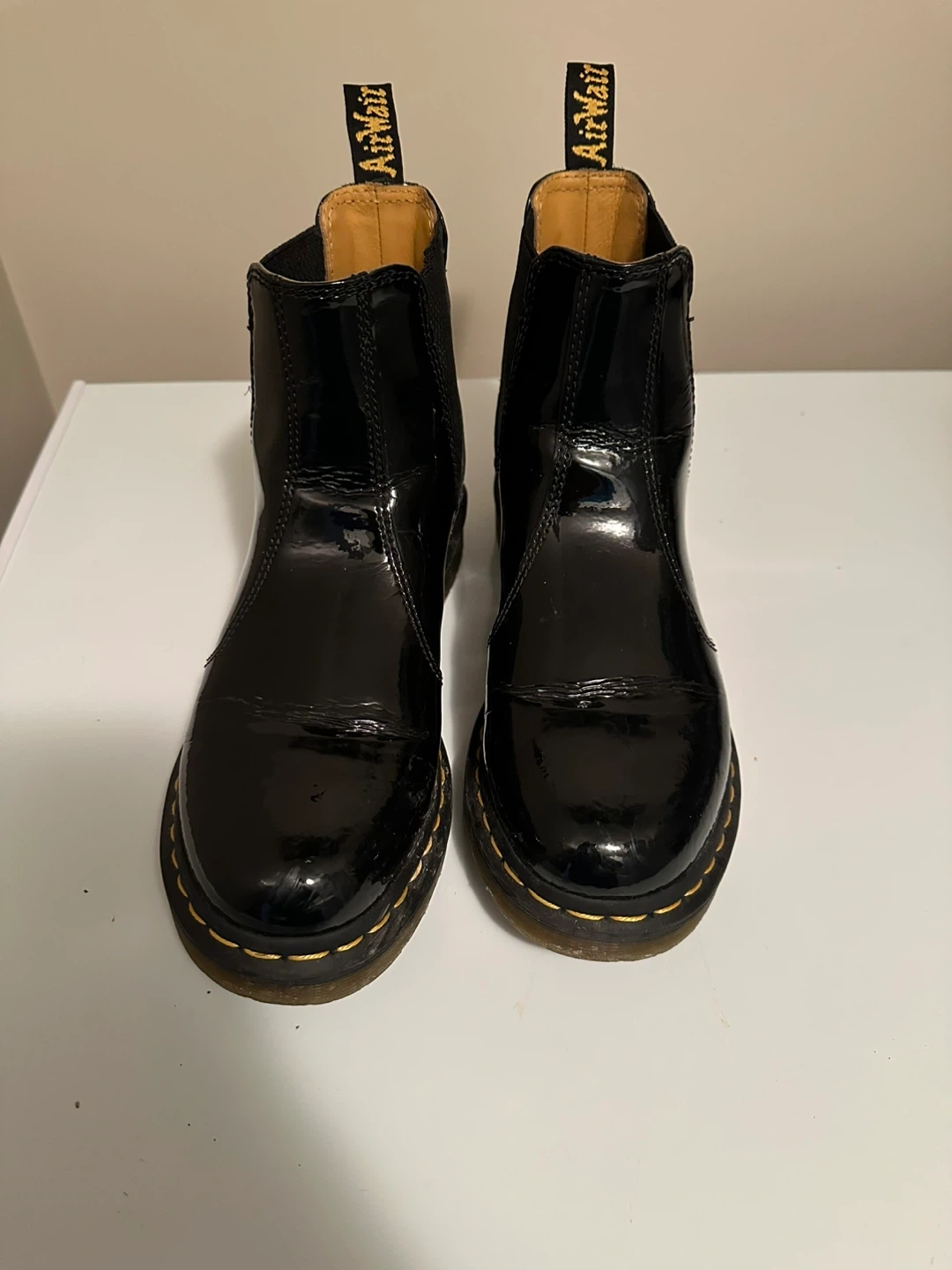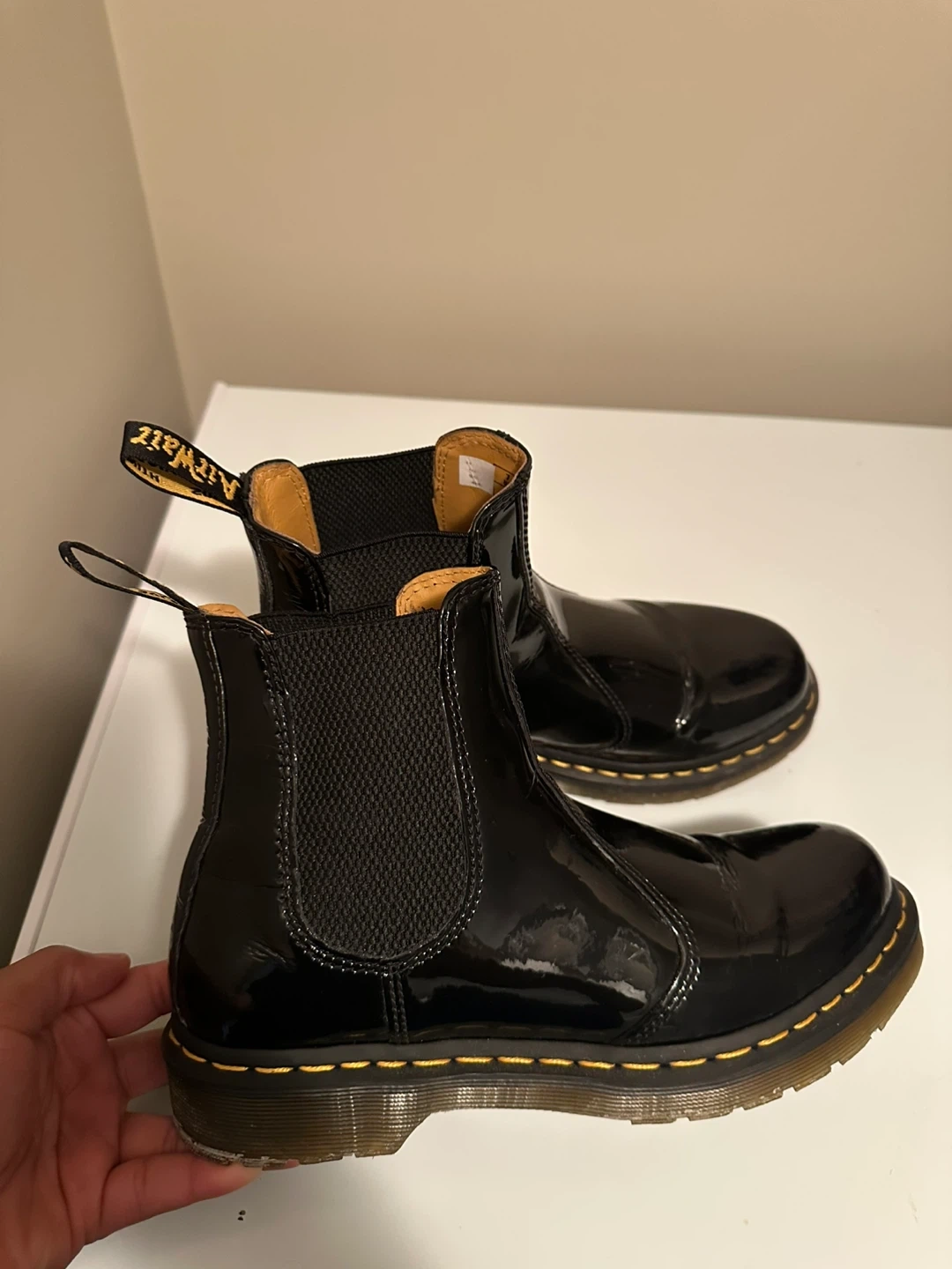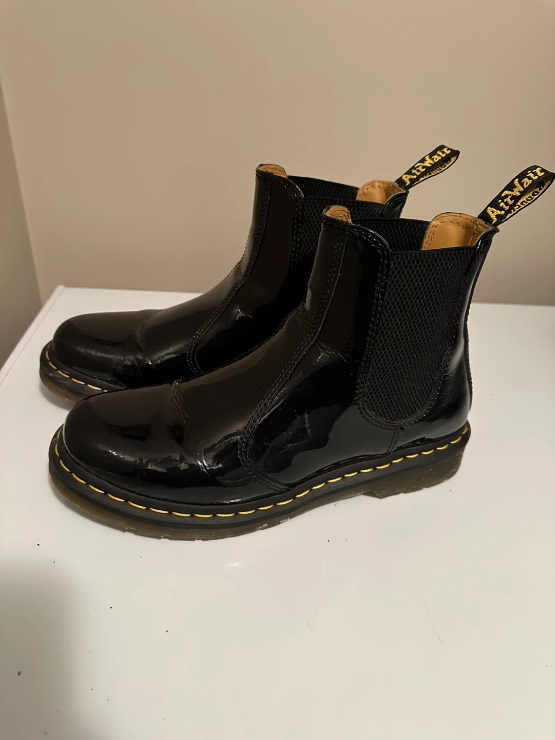 Dr. Martens 2976 Chelsea boots in a shiny black patent leather finish. Features elasticated side panels for easy on and off. Made in England.