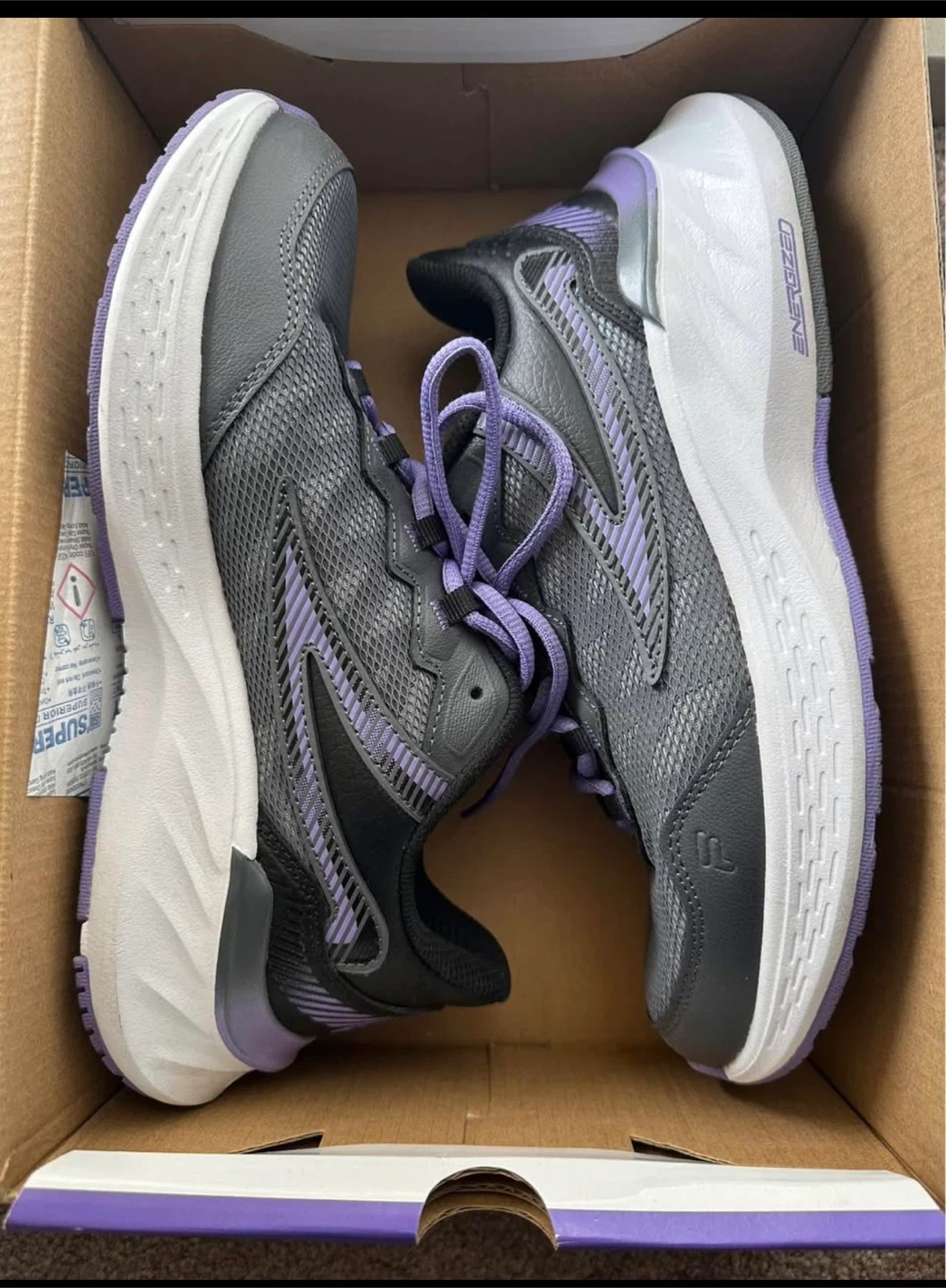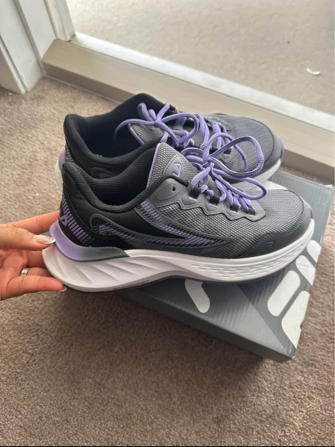 These Fila women's running shoes are grey with purple accents. They come with laces and are designed for comfort. The sole offers good traction.