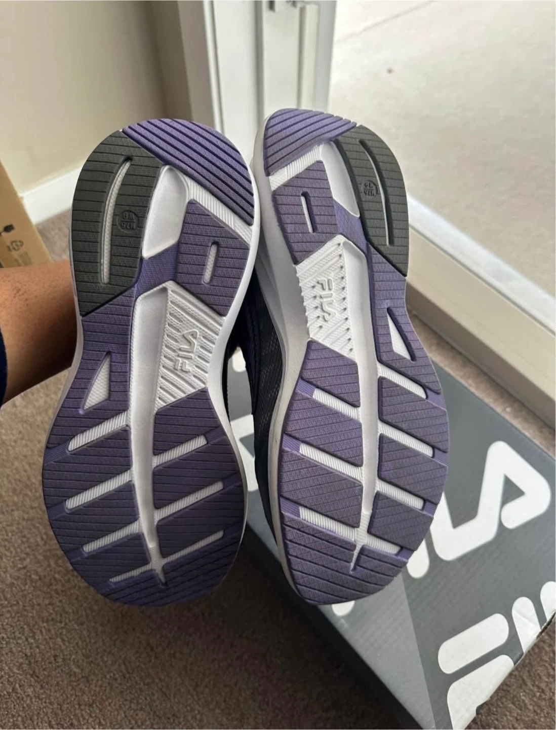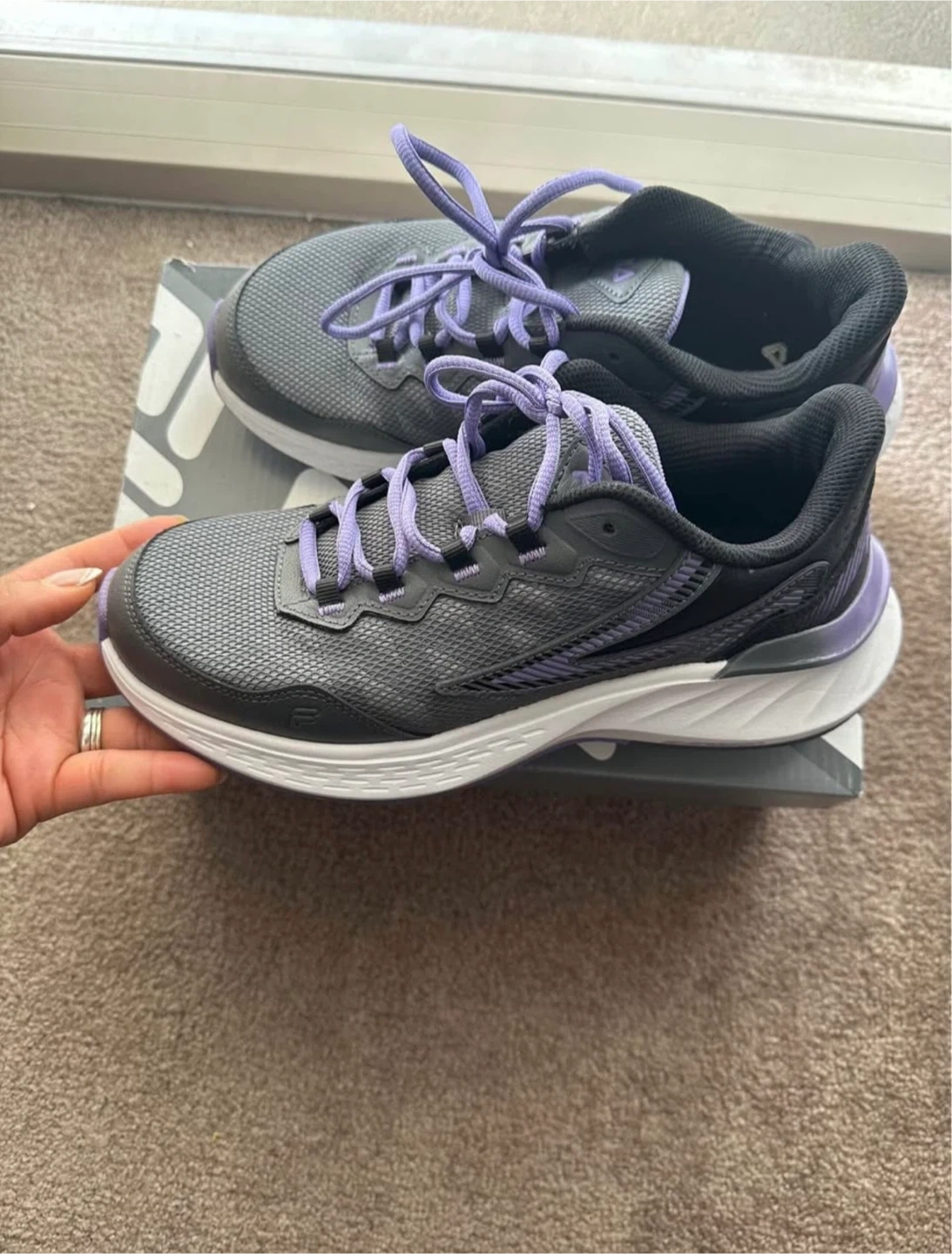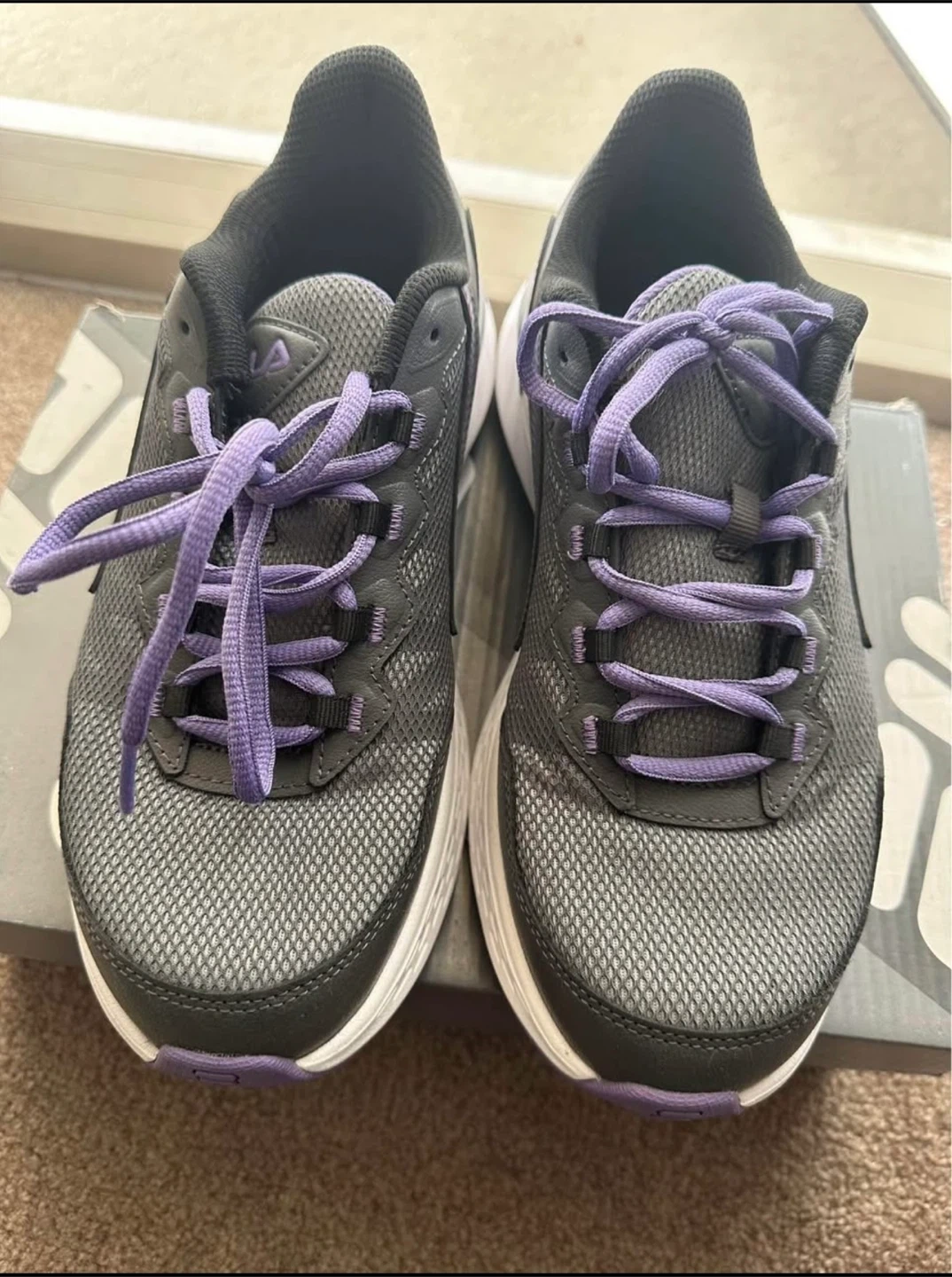 These Fila women's running shoes are grey with purple accents. They come with laces and are designed for comfort. The sole offers good traction.
