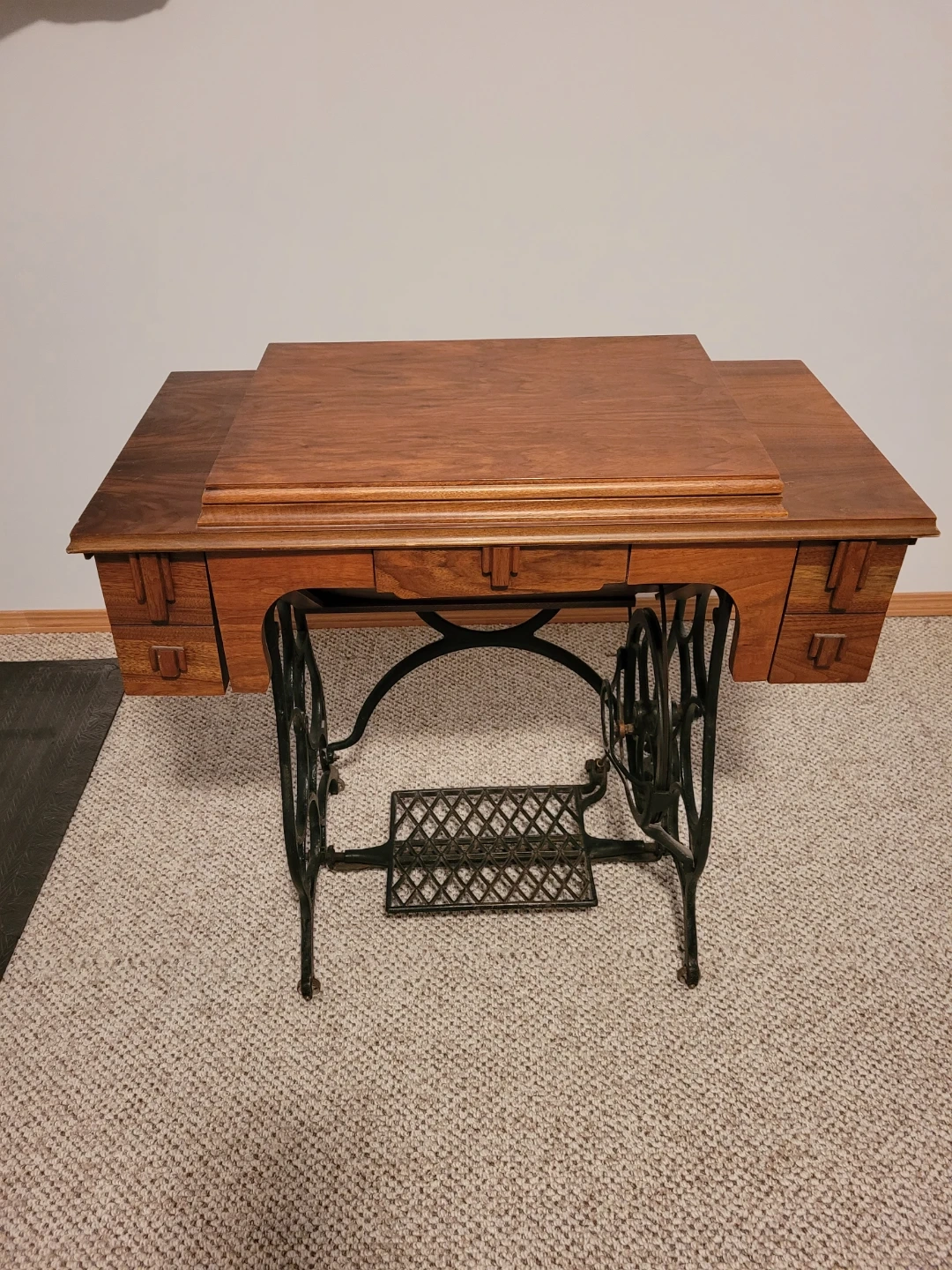 This is a Reliance treadle sewing machine set into a wooden cabinet. It has a foot-powered pedal mechanism. The cabinet has drawers for storage and a flip-top lid to conceal the machine.Different feet attachments for different stitches