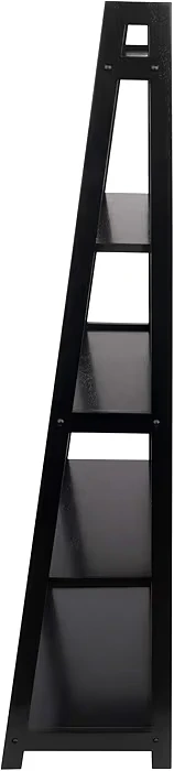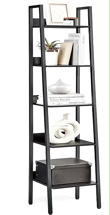 Five-tier ladder shelf with black metal frame and wooden shelves. Clean, modern look with plenty of storage space. Great for books, plants, or décor. Space-saving vertical design, sturdy and stylish—perfect for living room, bedroom, or office.