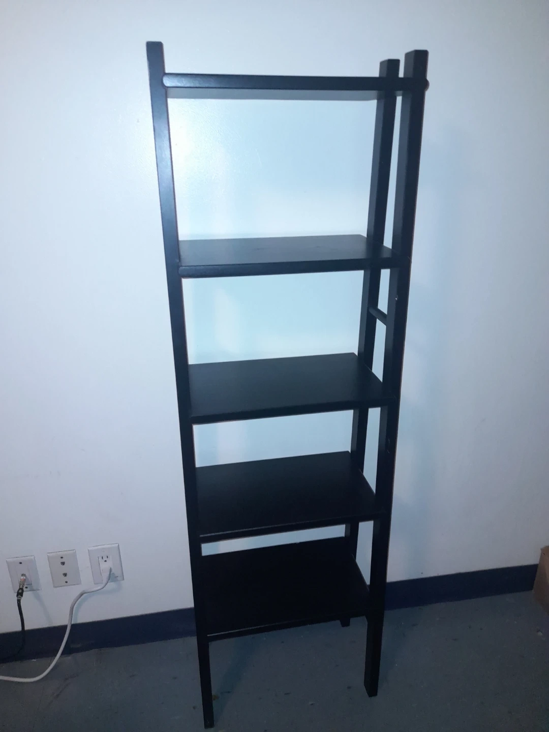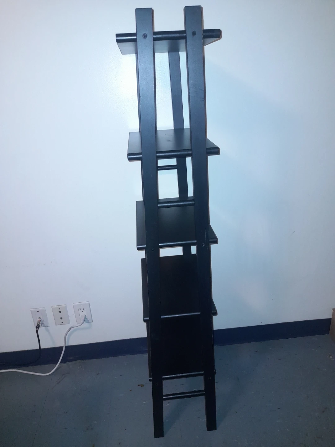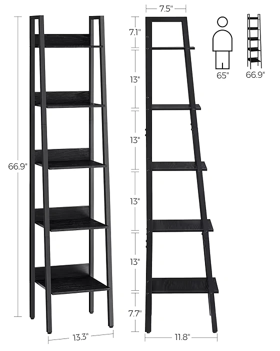 Five-tier ladder shelf with black metal frame and wooden shelves. Clean, modern look with plenty of storage space. Great for books, plants, or décor. Space-saving vertical design, sturdy and stylish—perfect for living room, bedroom, or office.