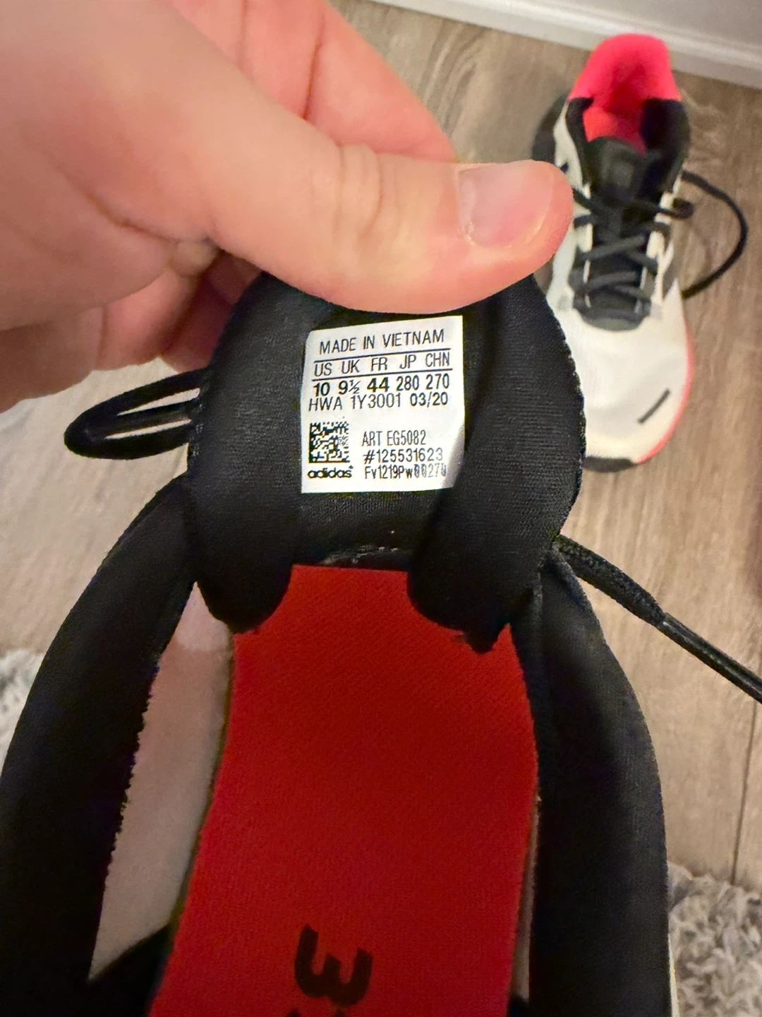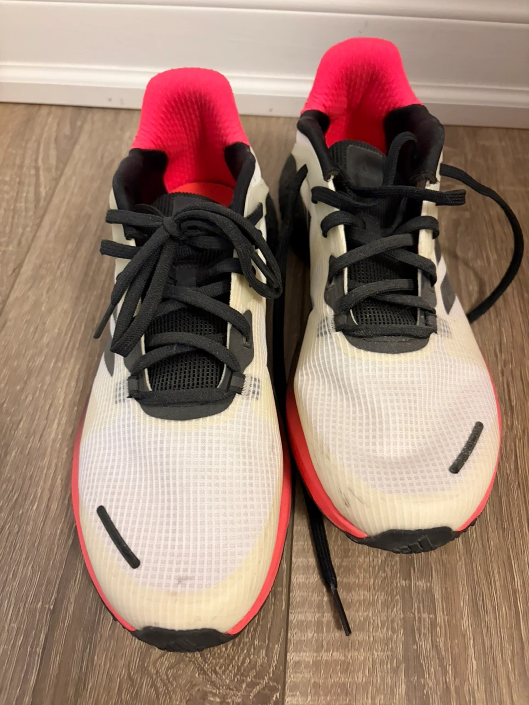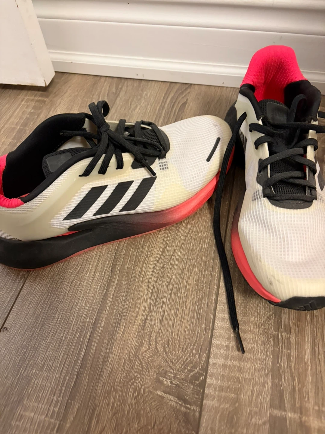 White and neon pink Adidas running shoes. Men's US size 10 , UK 9.5, FR 44. Made in Vietnam. They feature a mesh upper and rubber sole.
