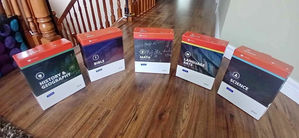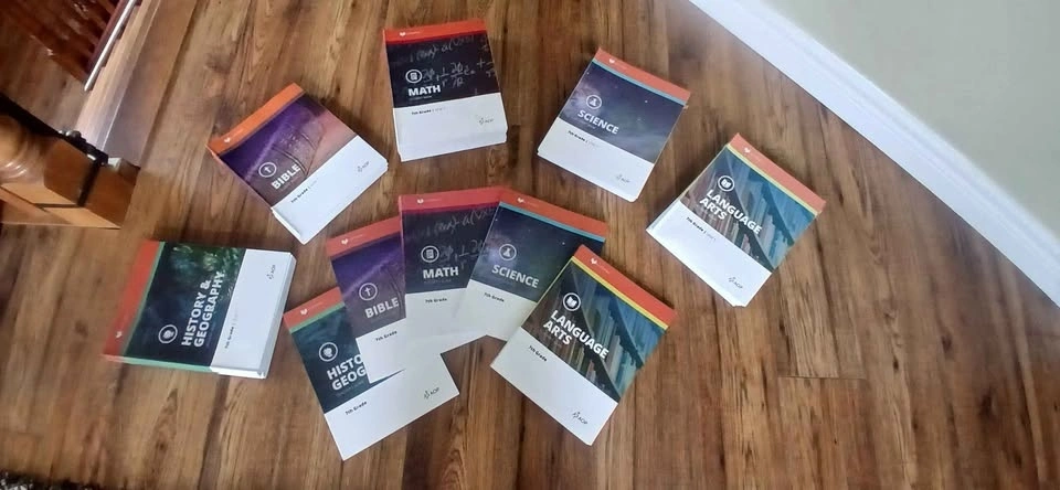 Set has 55 books in total! Includes the following subjects: Bible, Math, English, Science, History. EACH subject comes with 1 teacher manual and 10 individual unit workbooks. Great curriculum. Used but can be erased. Worth over $600 new.