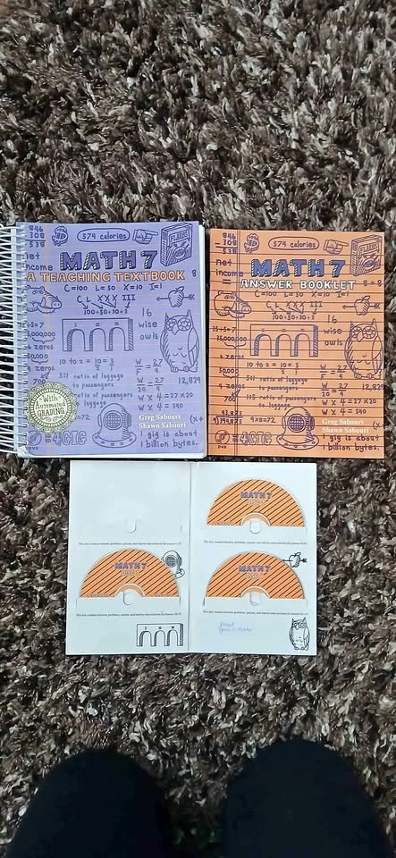 Teaching Textbooks grade 7 Math course. Package includes textbook, workbook, and answer key. CDs are included, though one is missing.