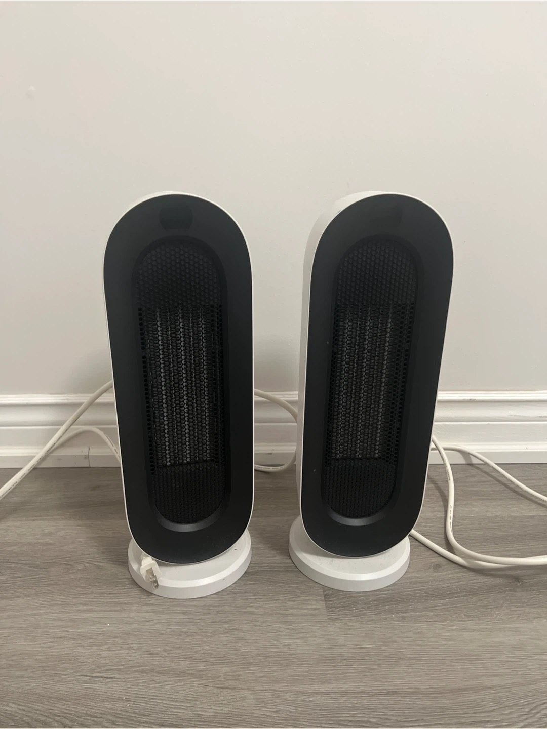 A pair of white portable heaters. They're designed for personal space heating and have a modern look. Great for a small room or office! Barely used for 2 years. Like new.