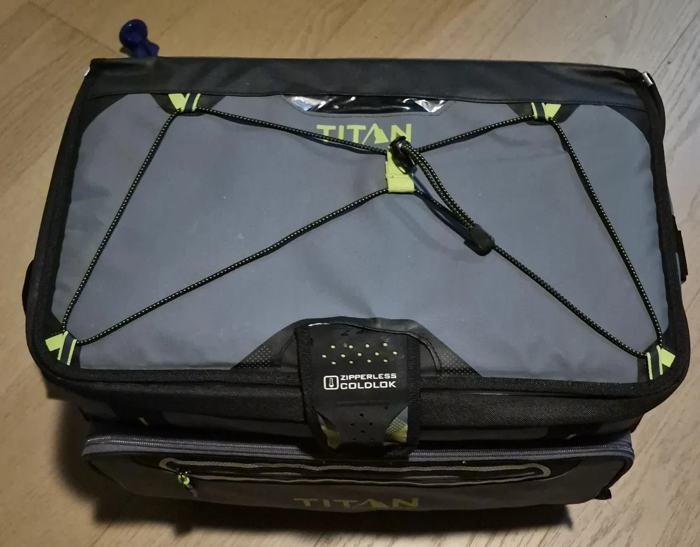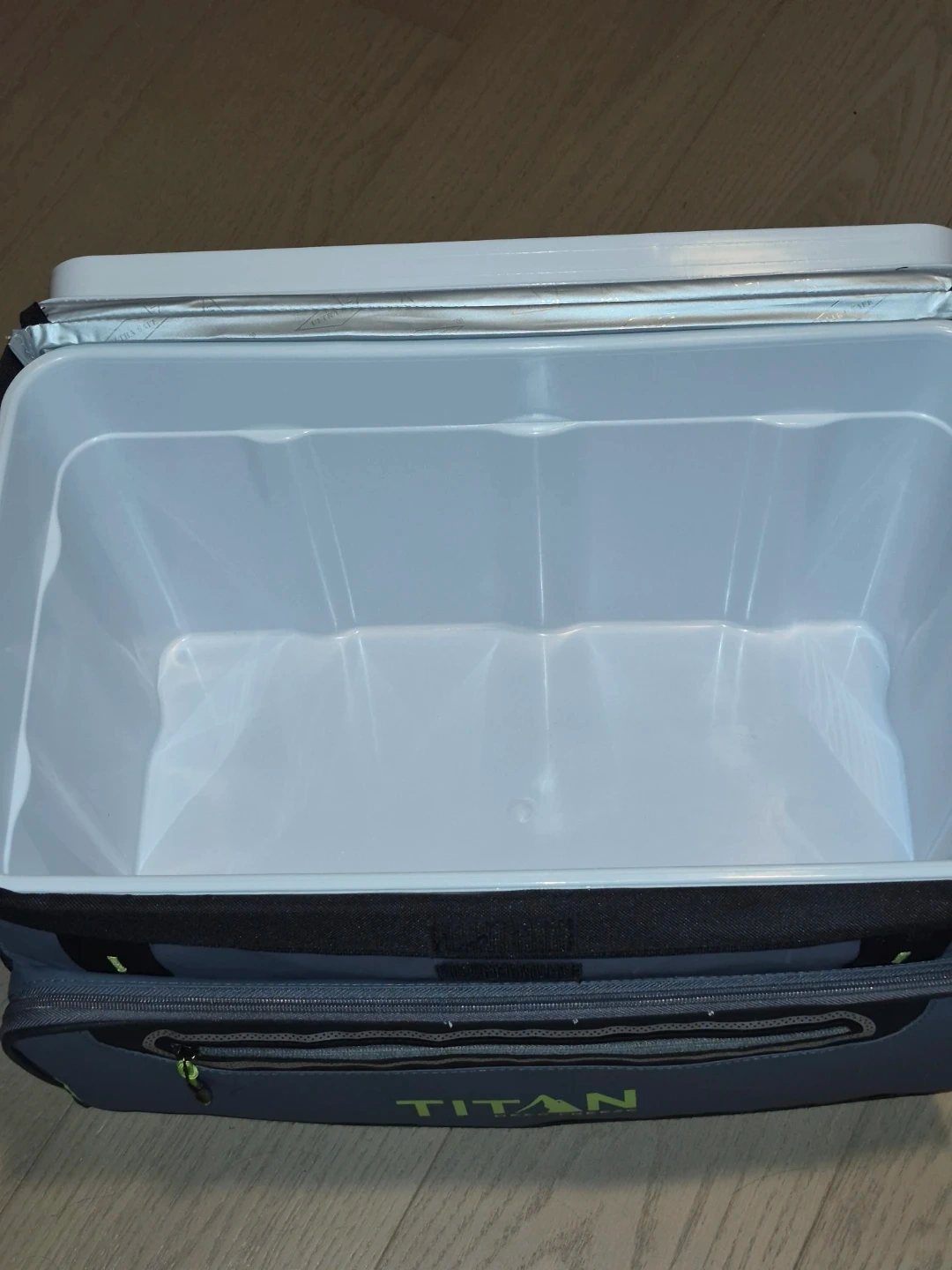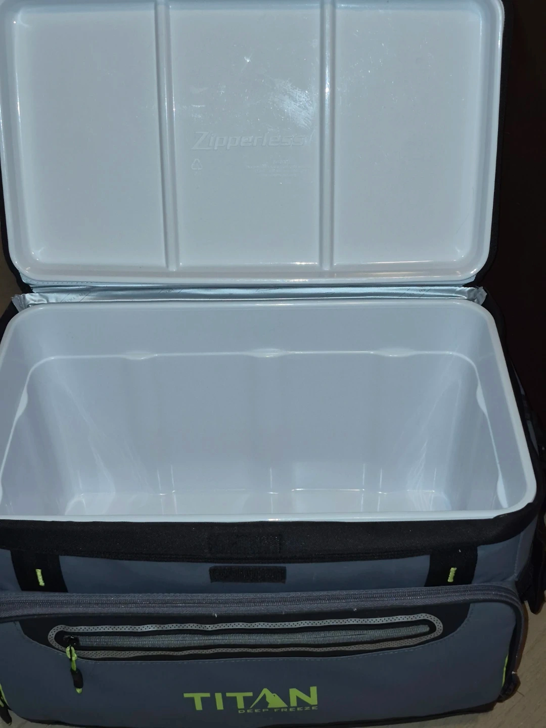 This is a TITAN Deep Freeze cooler. It features a zipperless lid for easy access. The interior is made of durable plastic and is insulated to keep items cold.