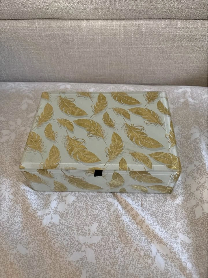 Decorative glass keepsake box with a feather-patterned glass exterior and black velvet-lined interior. Hinged lid with ribbon support to keep it open. Ideal for storing jewelry, watches, letters, photos, or small keepsakes.