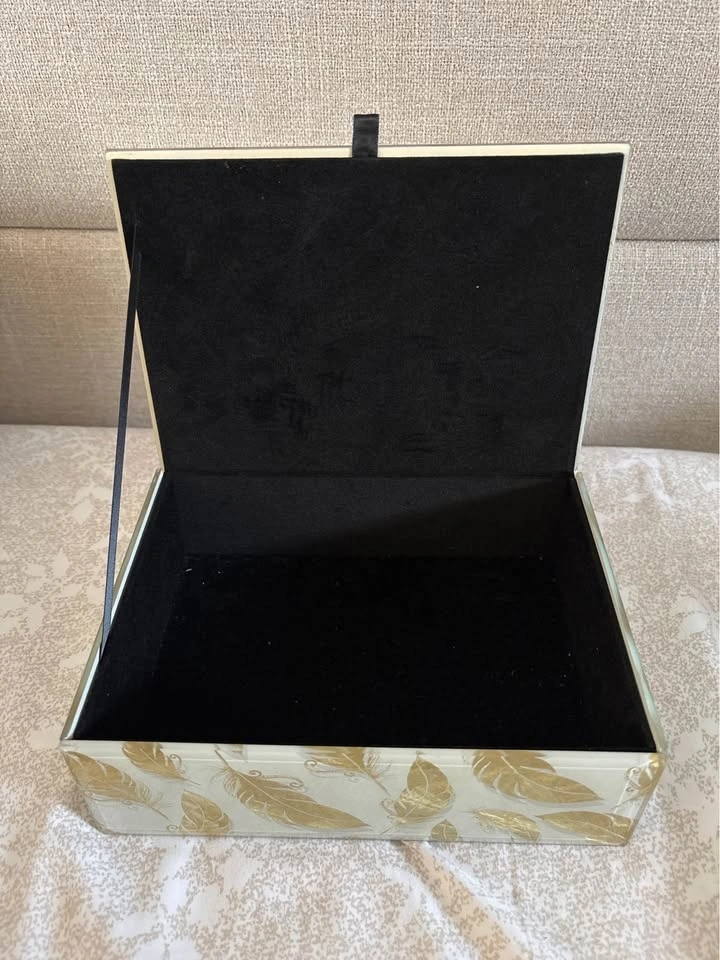Decorative glass keepsake box with a feather-patterned glass exterior and black velvet-lined interior. Hinged lid with ribbon support to keep it open. Ideal for storing jewelry, watches, letters, photos, or small keepsakes.