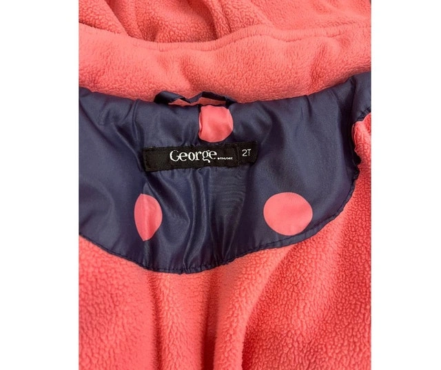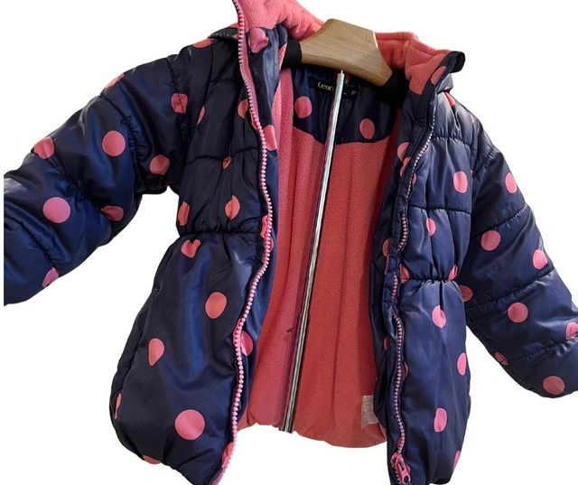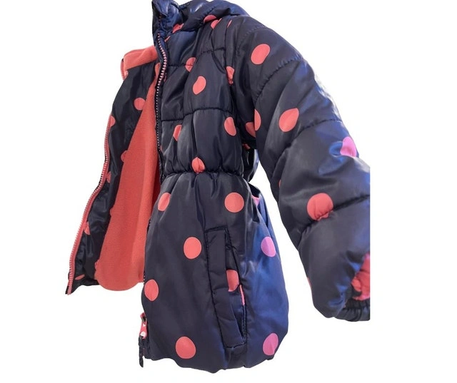 Cozy, beautiful, and thick jacket for size 2T. Features 2 pockets. Warm and ideal for fall or early winter. Color: Navy blue with pink polka dots. Condition: Used - Like new.