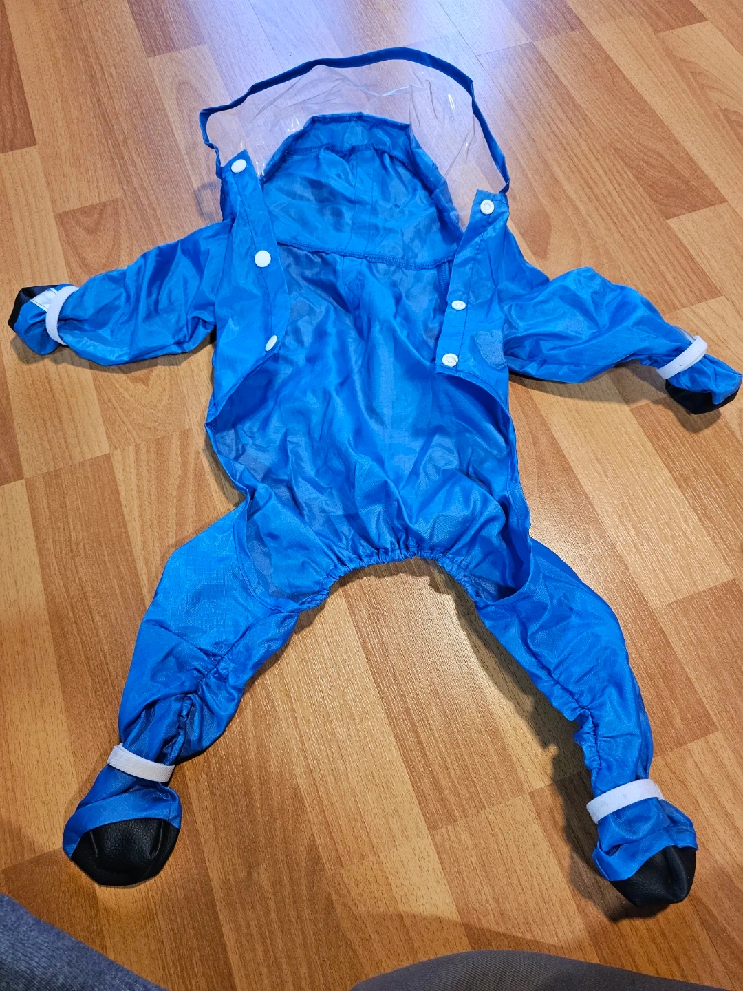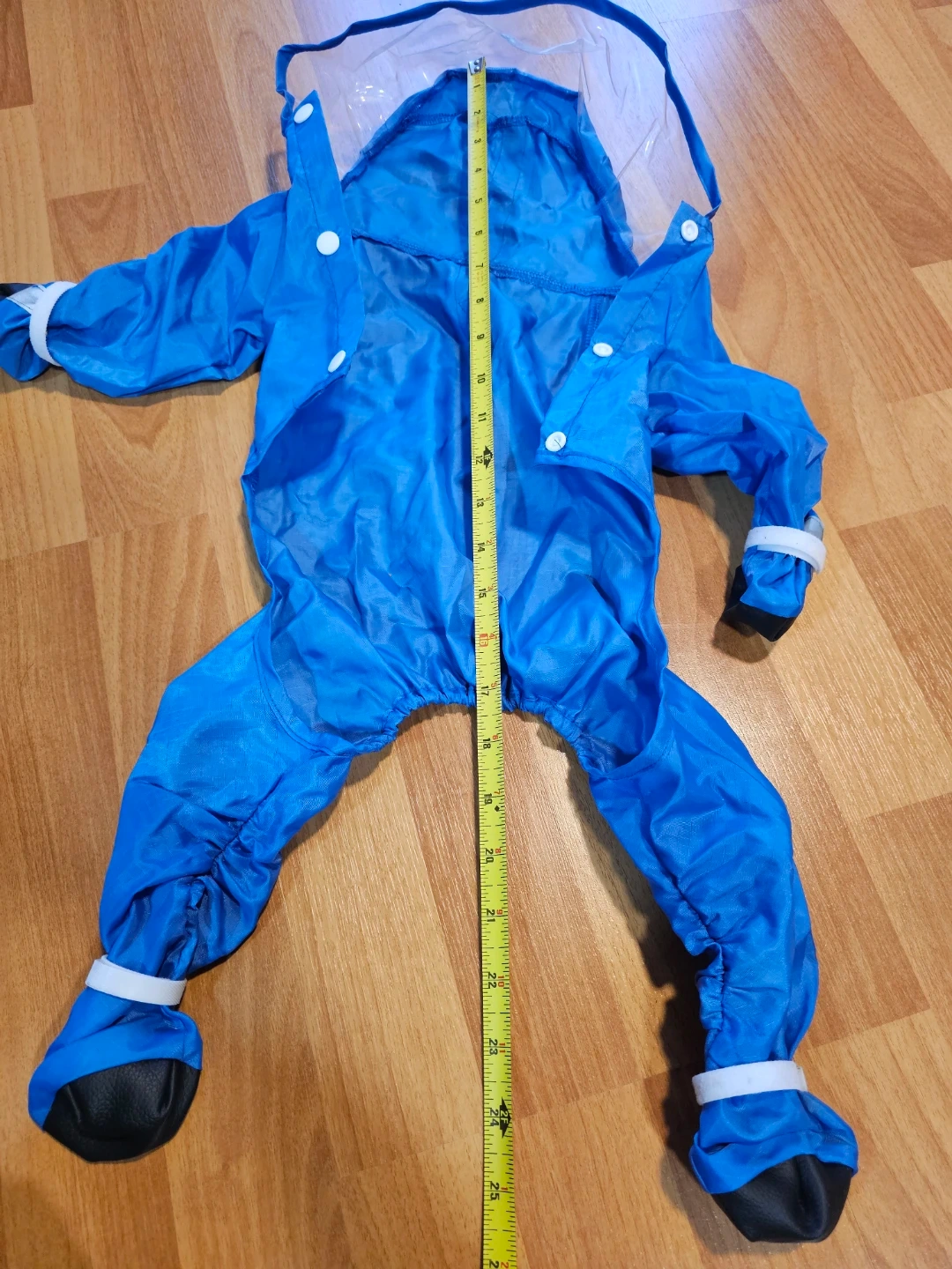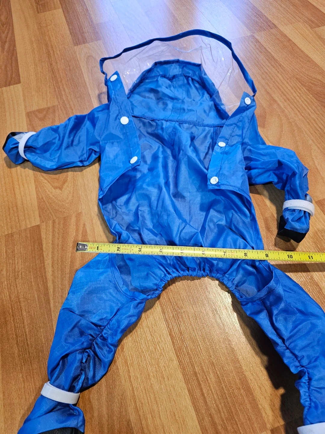 Brand new. This is a blue doggy raincoat with a hood. It has reflective piping for visibility. The suit is approximately 24 inches long from neck to tail.