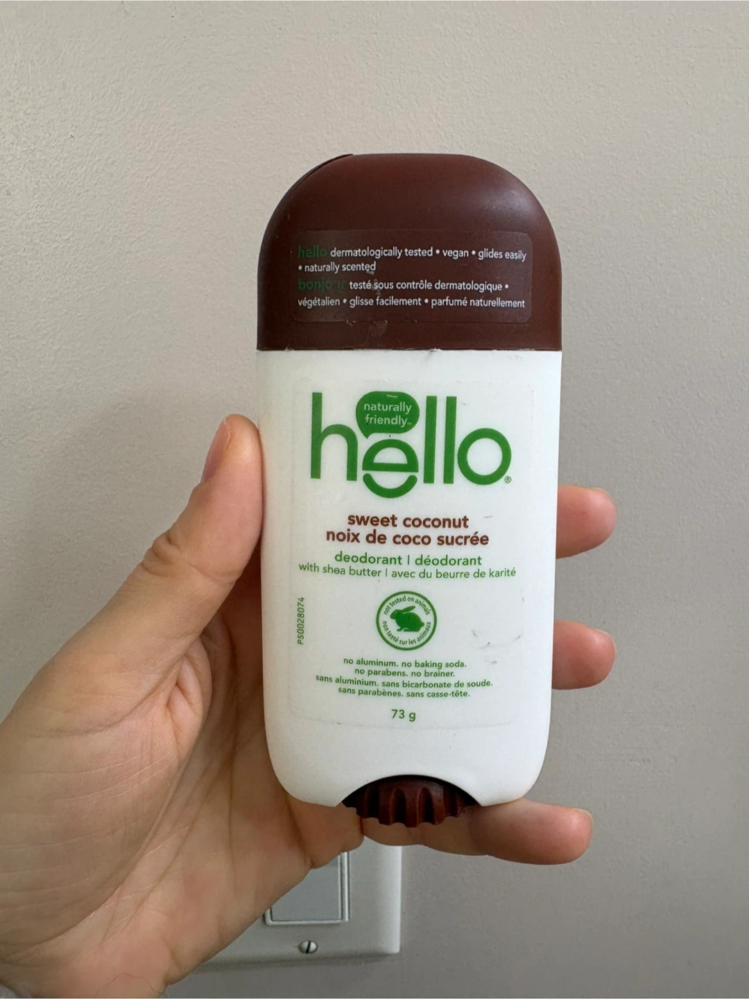 Hello deodorant in sweet coconut with shea butter. Dermatologically tested, vegan, and naturally scented.