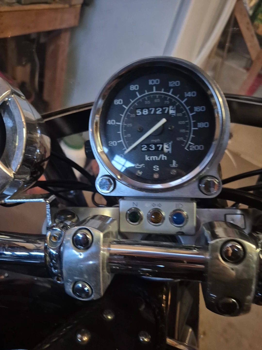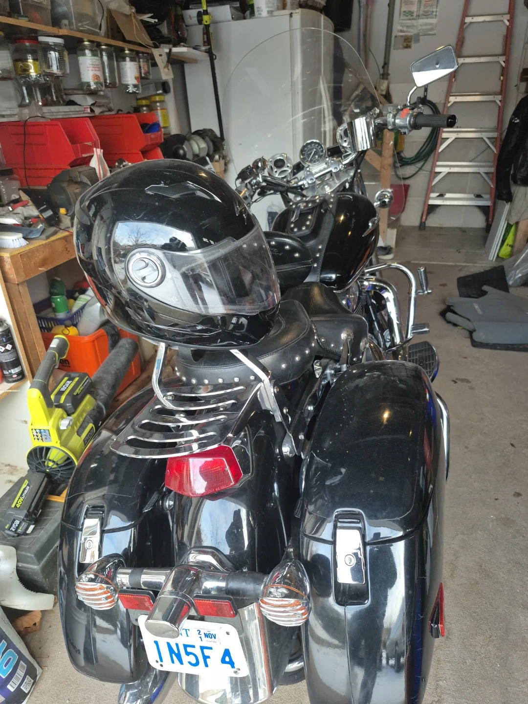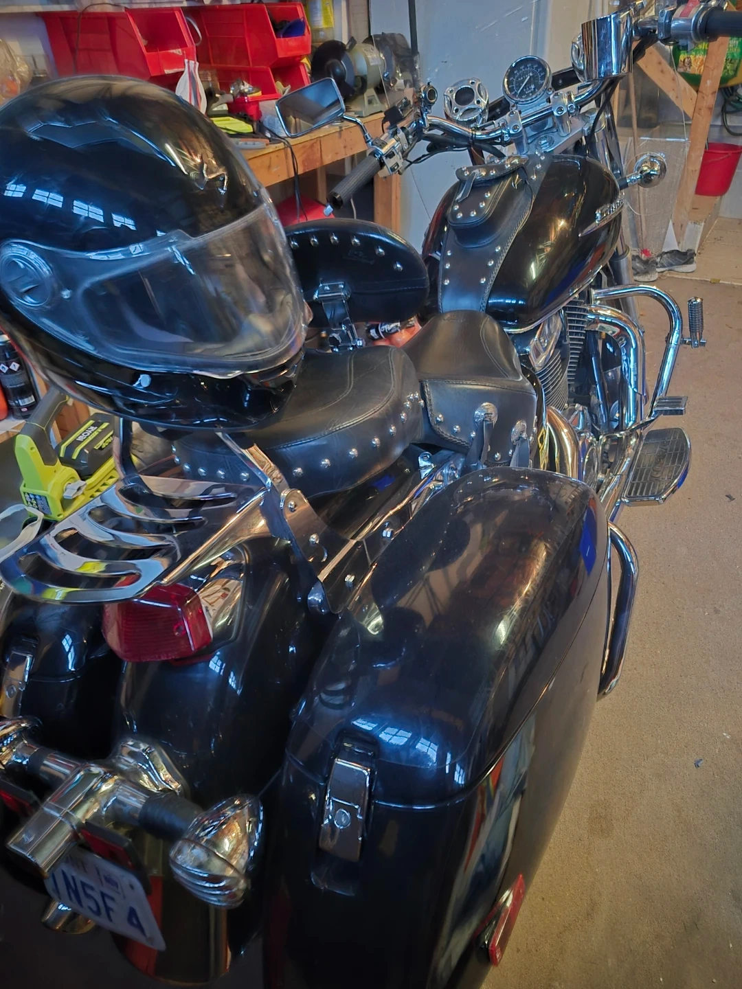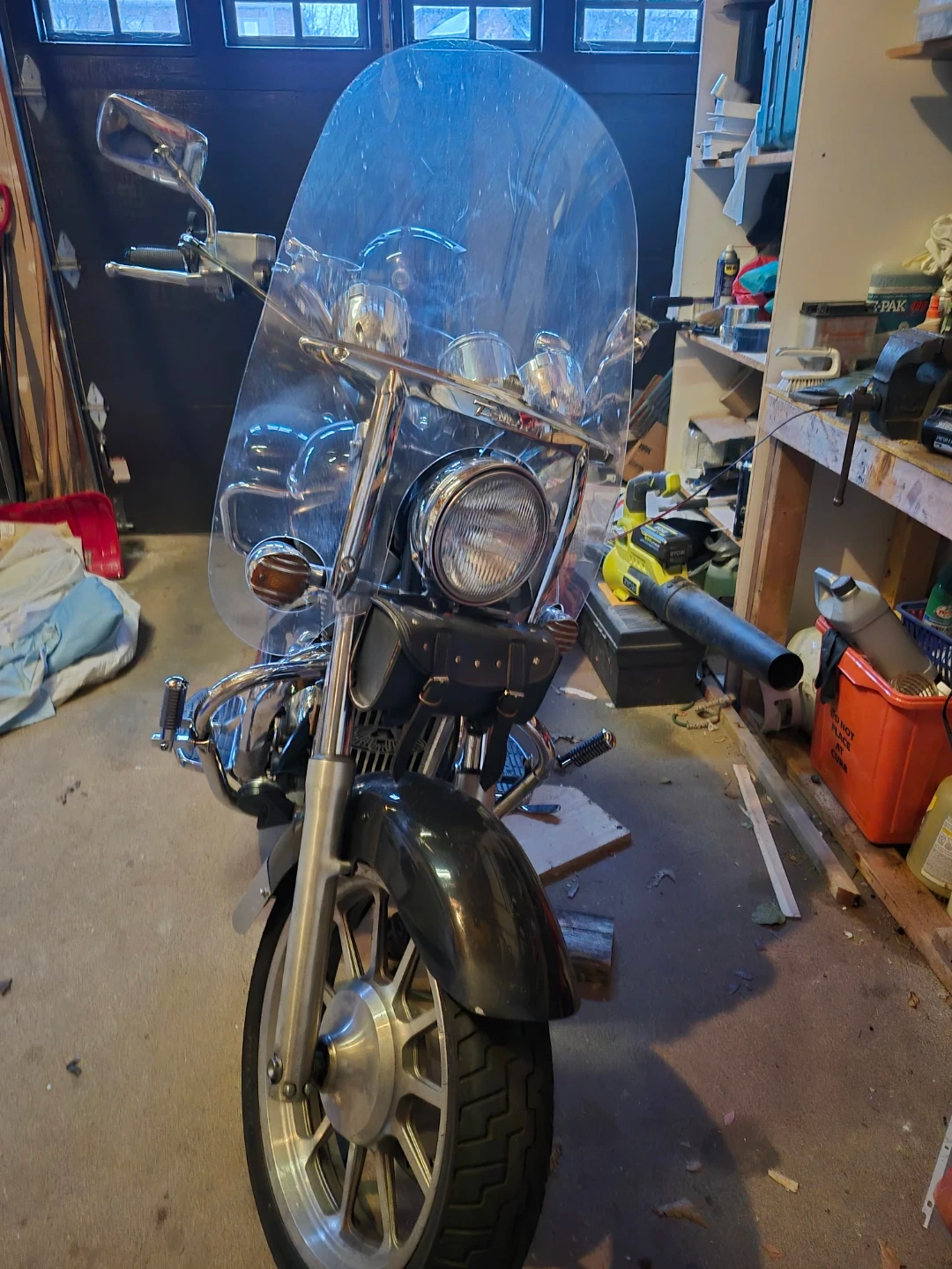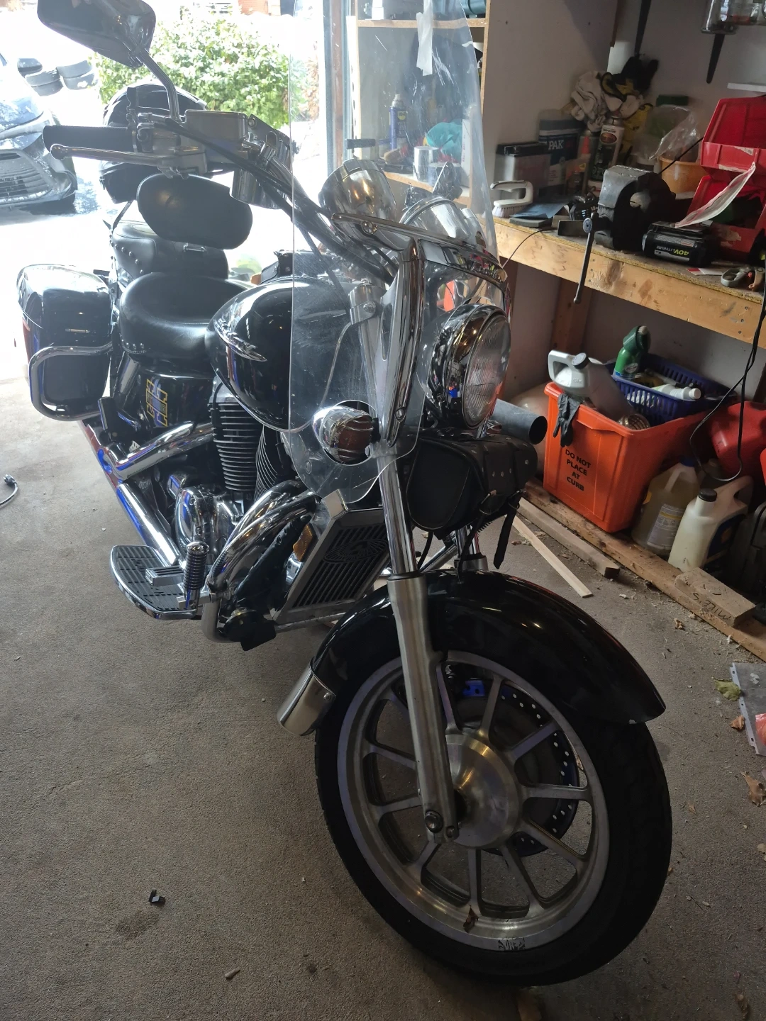 This black cruiser motorcycle comes equipped with spacious saddlebags for all your gear. It has a clear windshield and comfortable seating. The odometer shows 58,727 km.
