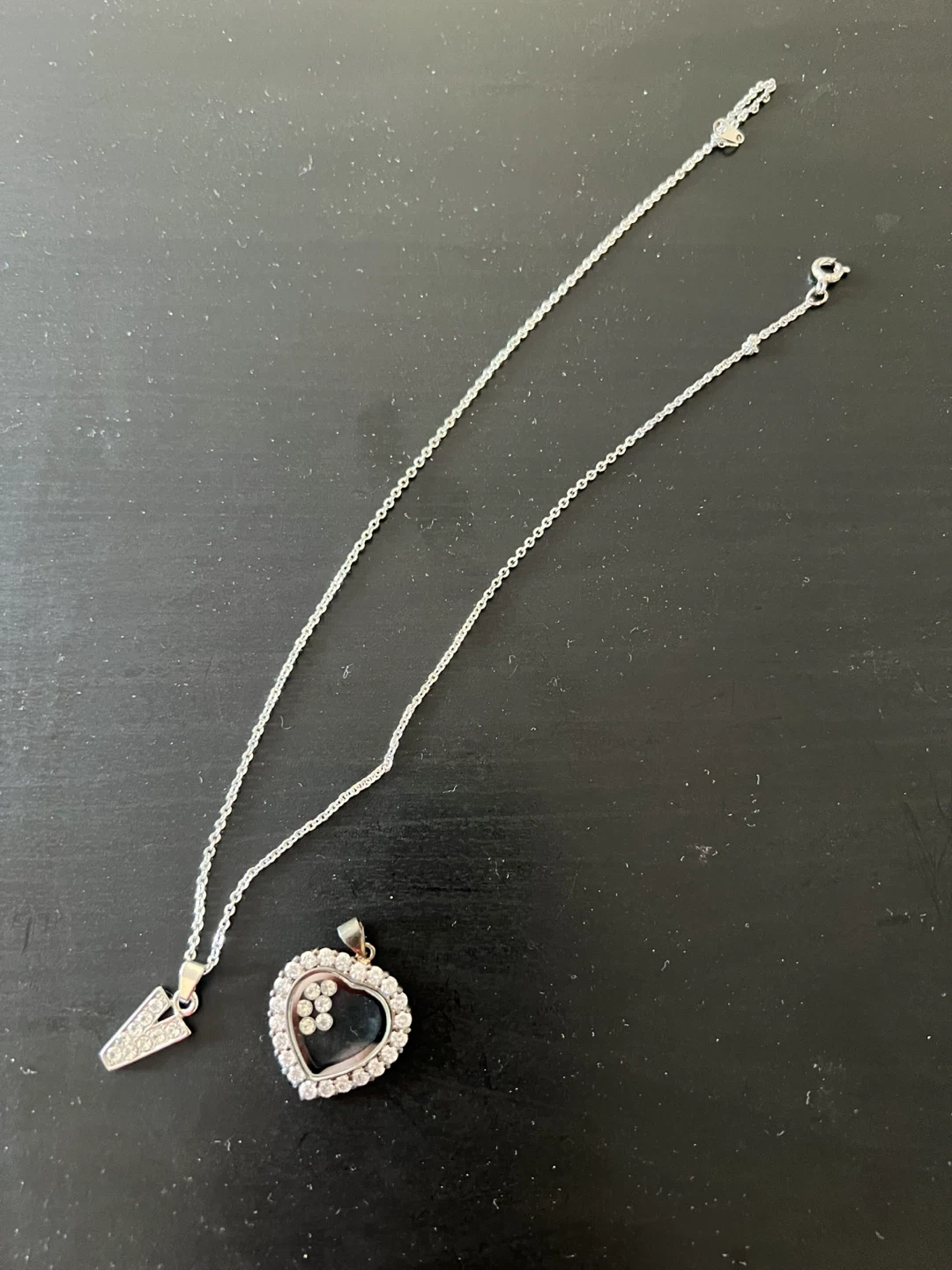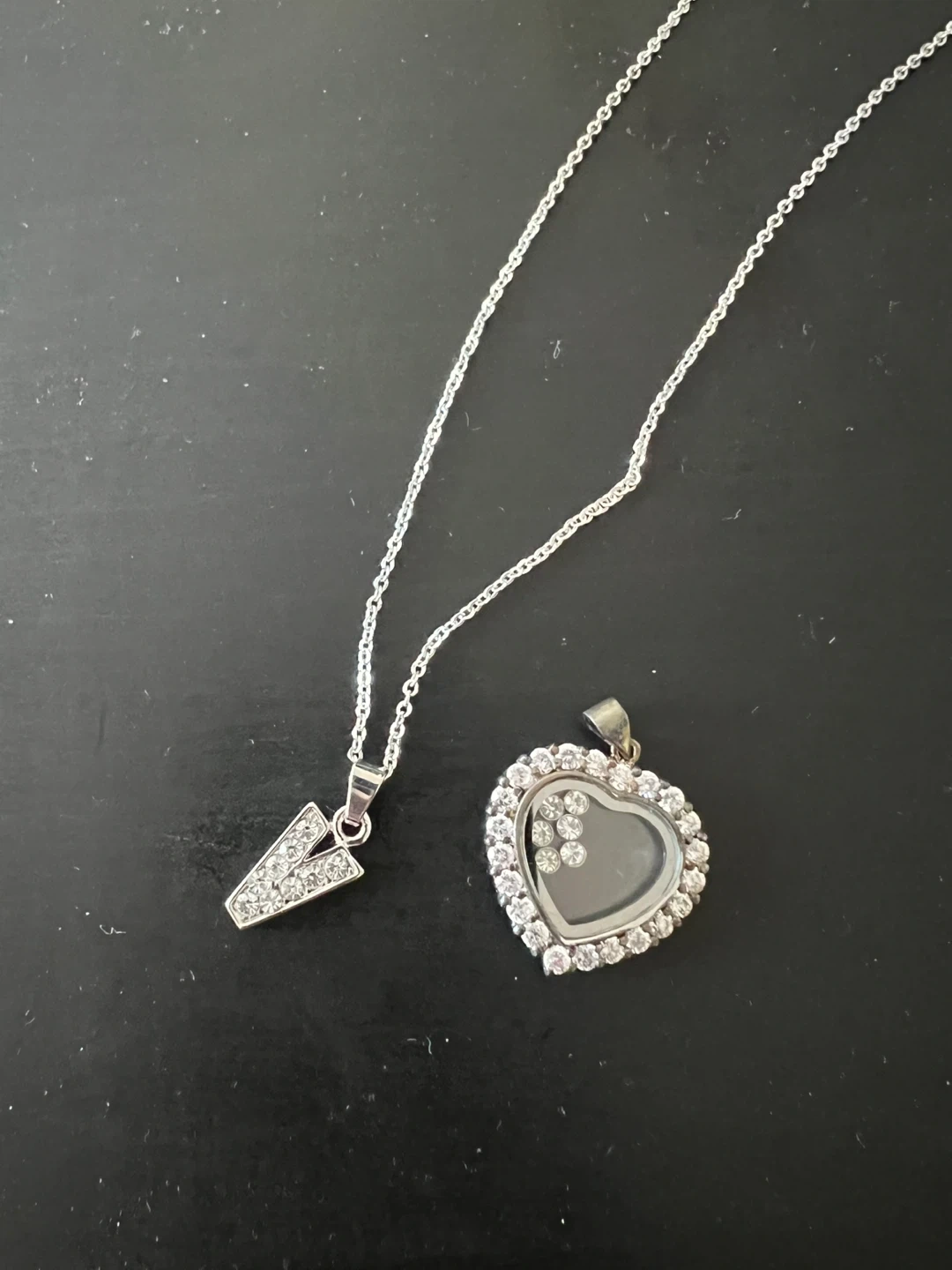 A delicate silver-tone chain with two pendants. One is a heart-shaped locket surrounded by clear stones, and the other is a "V" initial pendant also adorned with clear stones. It's a lovely set for adding a touch of sparkle!