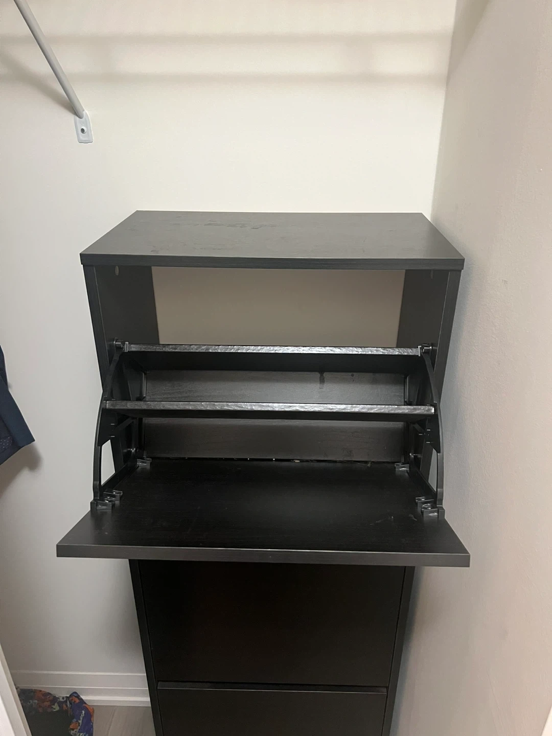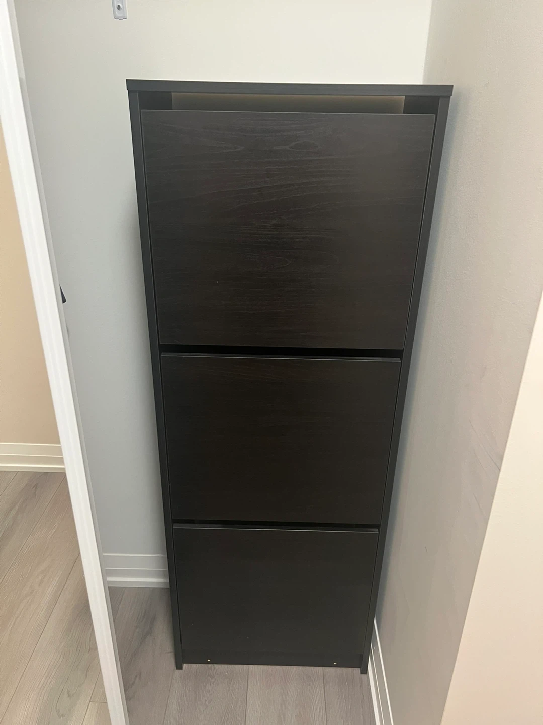 Selling a gently used IKEA bissa shoe cabinet in black-brown. It's in great condition and perfect for keeping your entryway organized. It has three compartments for shoes, providing ample storage while taking up minimal space. This cabinet is a stylish and functional addition to any home!