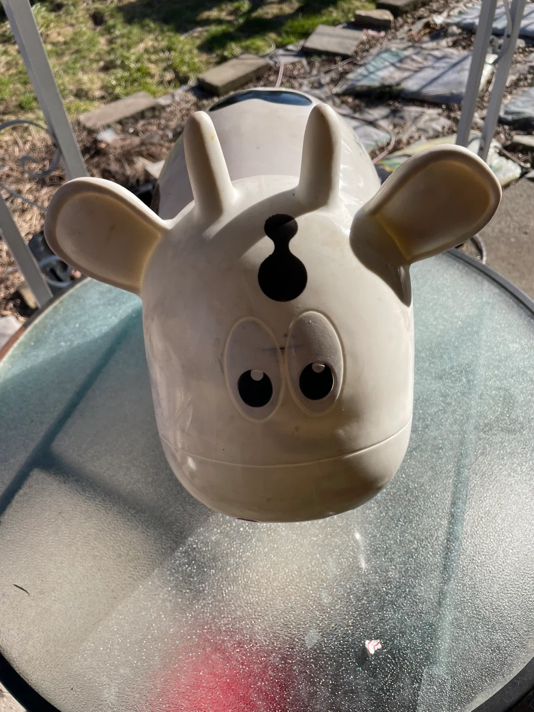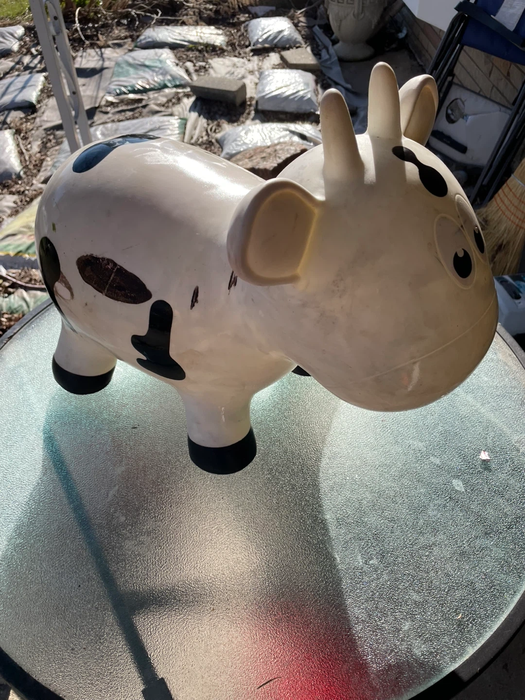 This is a bouncy cow hopper toy for kids. It's made of durable vinyl and features a fun cow design. Great for active play indoors or out! Bit worn. Still bounces.