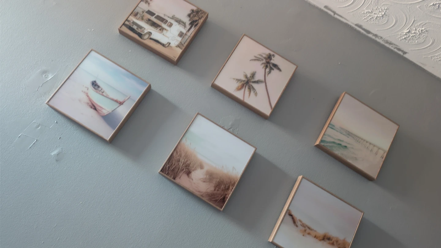 This set includes six framed art prints, each featuring a unique beach or coastal scene. The prints showcase sandy dunes, ocean views, palm trees, and a boat on the shore. They are framed with a light wood-coloured border. Add a touch of vacation vibe to any room!