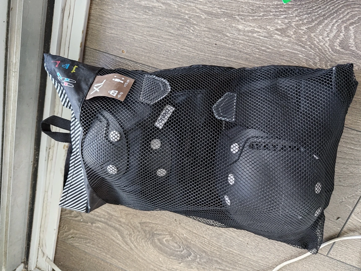 This set includes knee pads, elbow pads, and wrist guards in XL size. Designed for protection for users over 80 kg and 170 cm tall. Comes in a handy mesh bag.