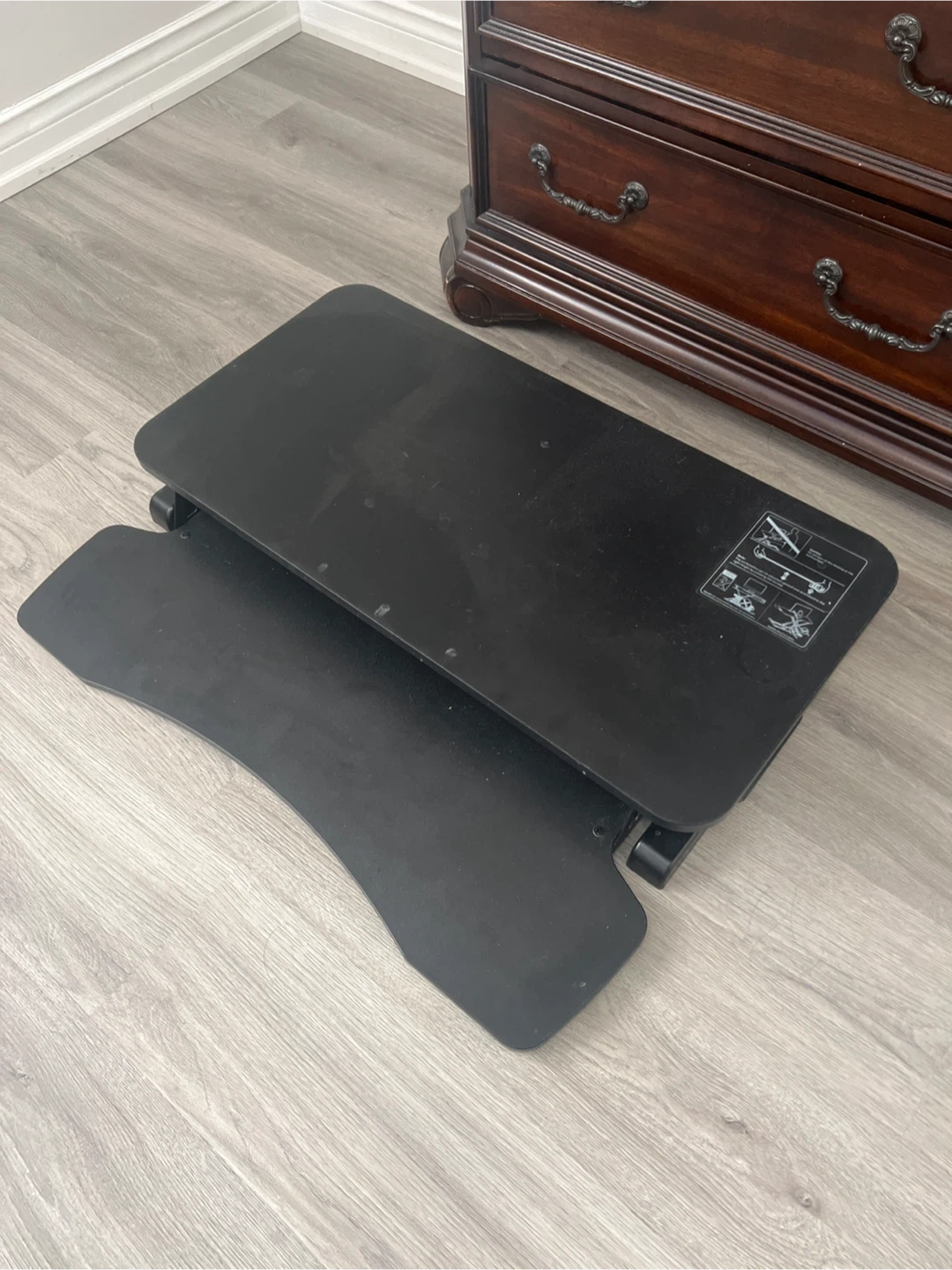 This black standing desk converter provides a stable surface for your monitor and keyboard. It's adjustable and folds down for easy storage. A great way to switch between sitting and standing while you work!