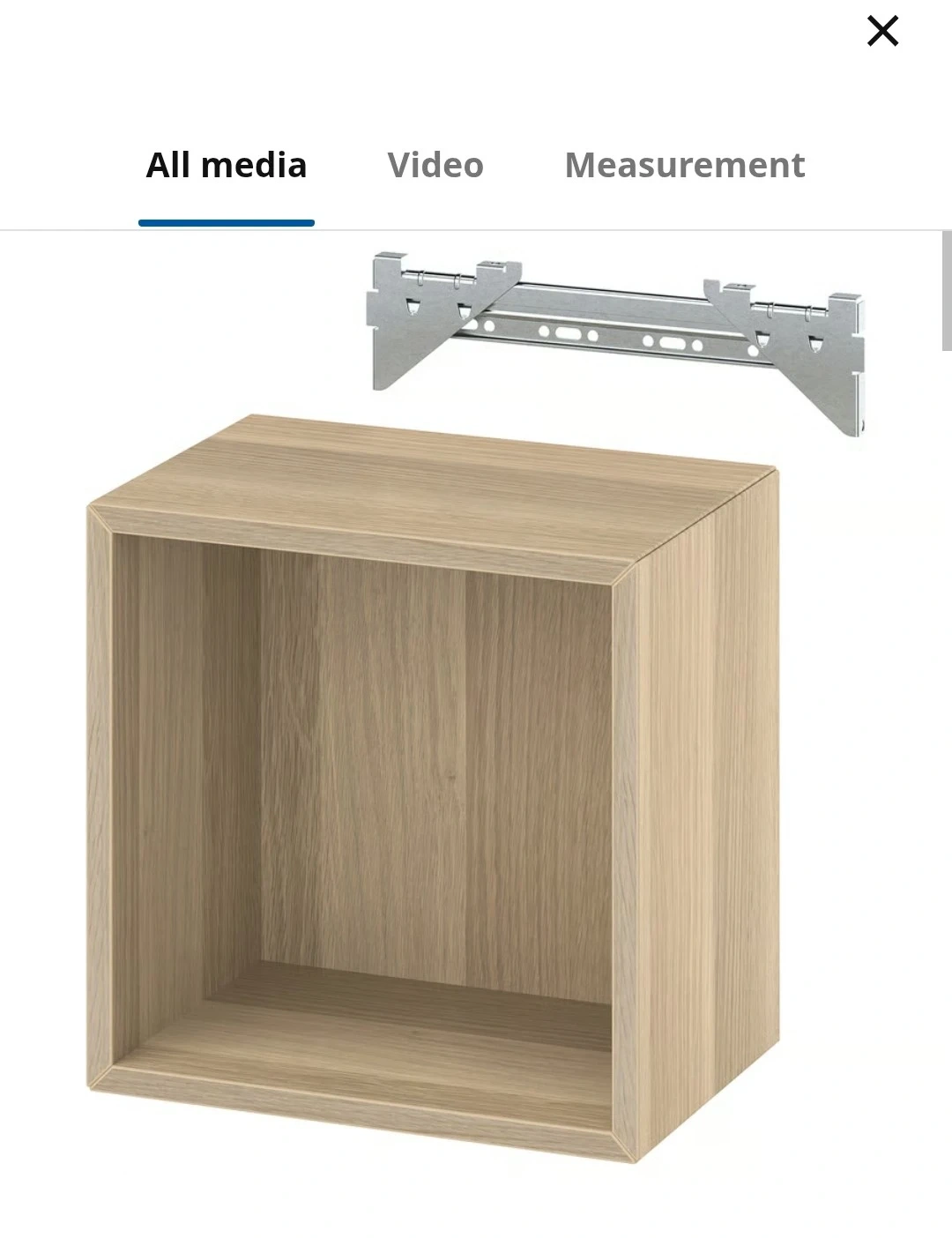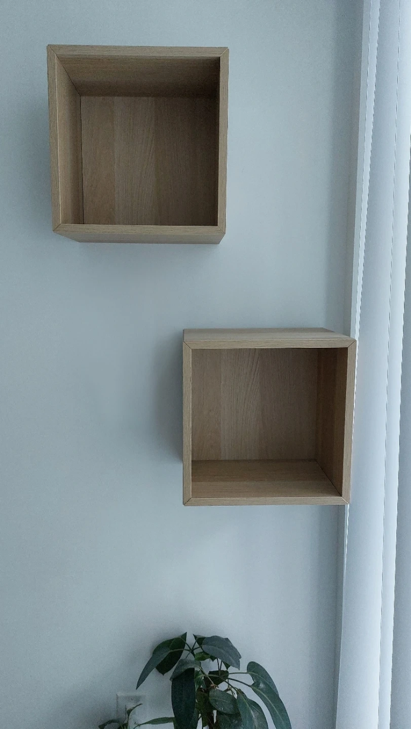 Two modern cube shelves made of oak veneer. The shelf measures are 35x35x25cm. They're great for books and displaying small items!