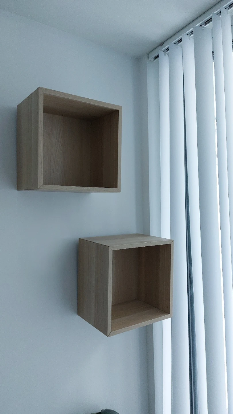 Two modern cube shelves made of oak veneer. The shelf measures are 35x35x25cm. They're great for books and displaying small items!
