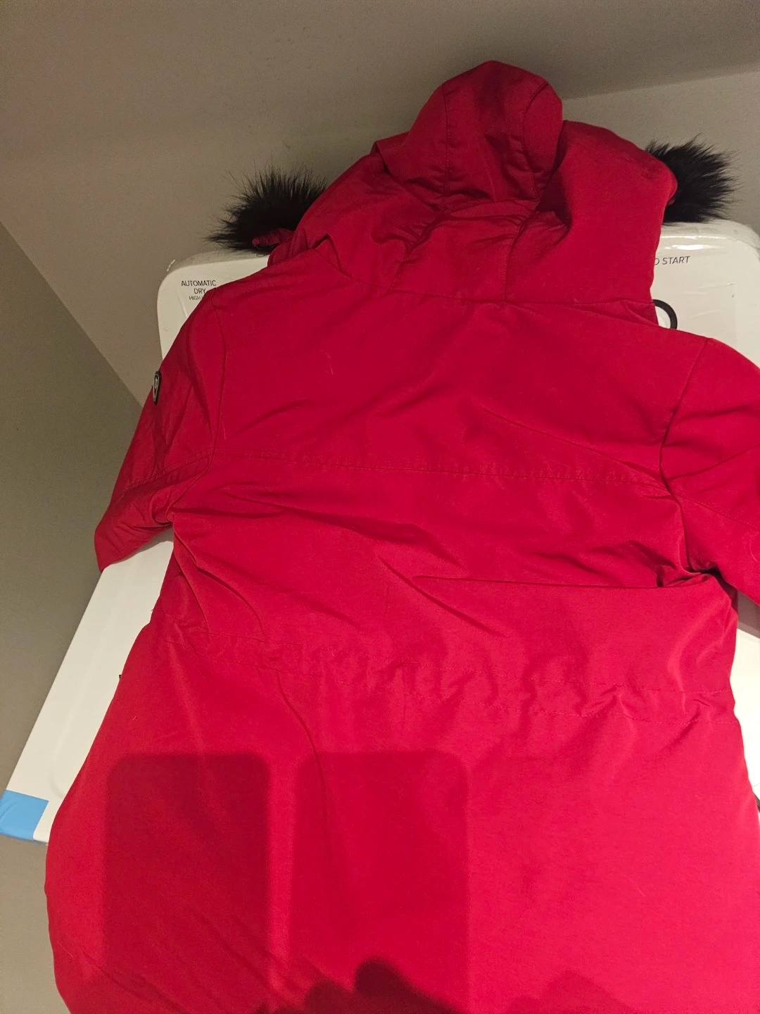 Red winter parka jacket by Canadiana. It features a faux fur-trimmed hood and multiple pockets. Size L/G.