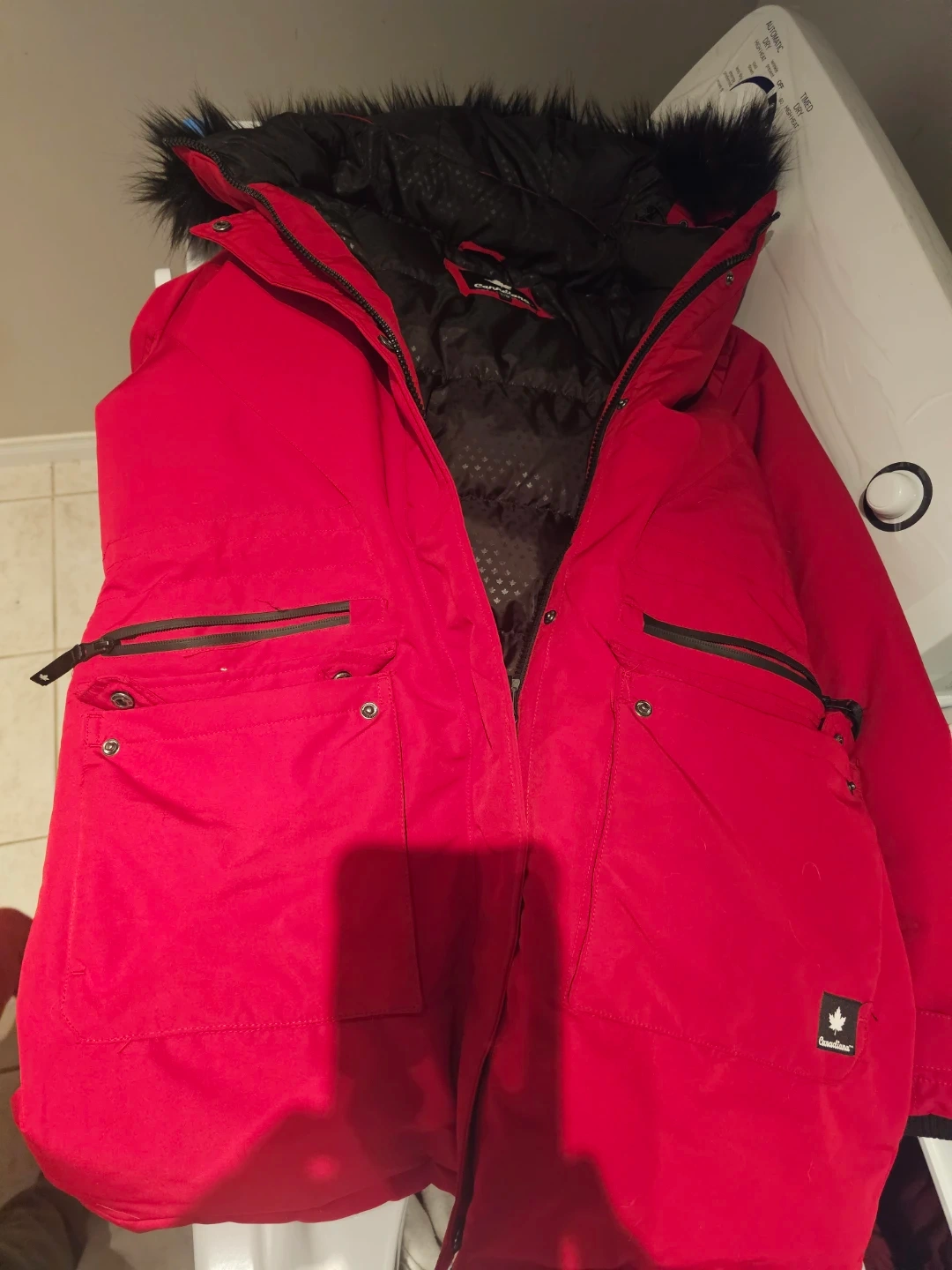 Red winter parka jacket by Canadiana. It features a faux fur-trimmed hood and multiple pockets. Size L/G.