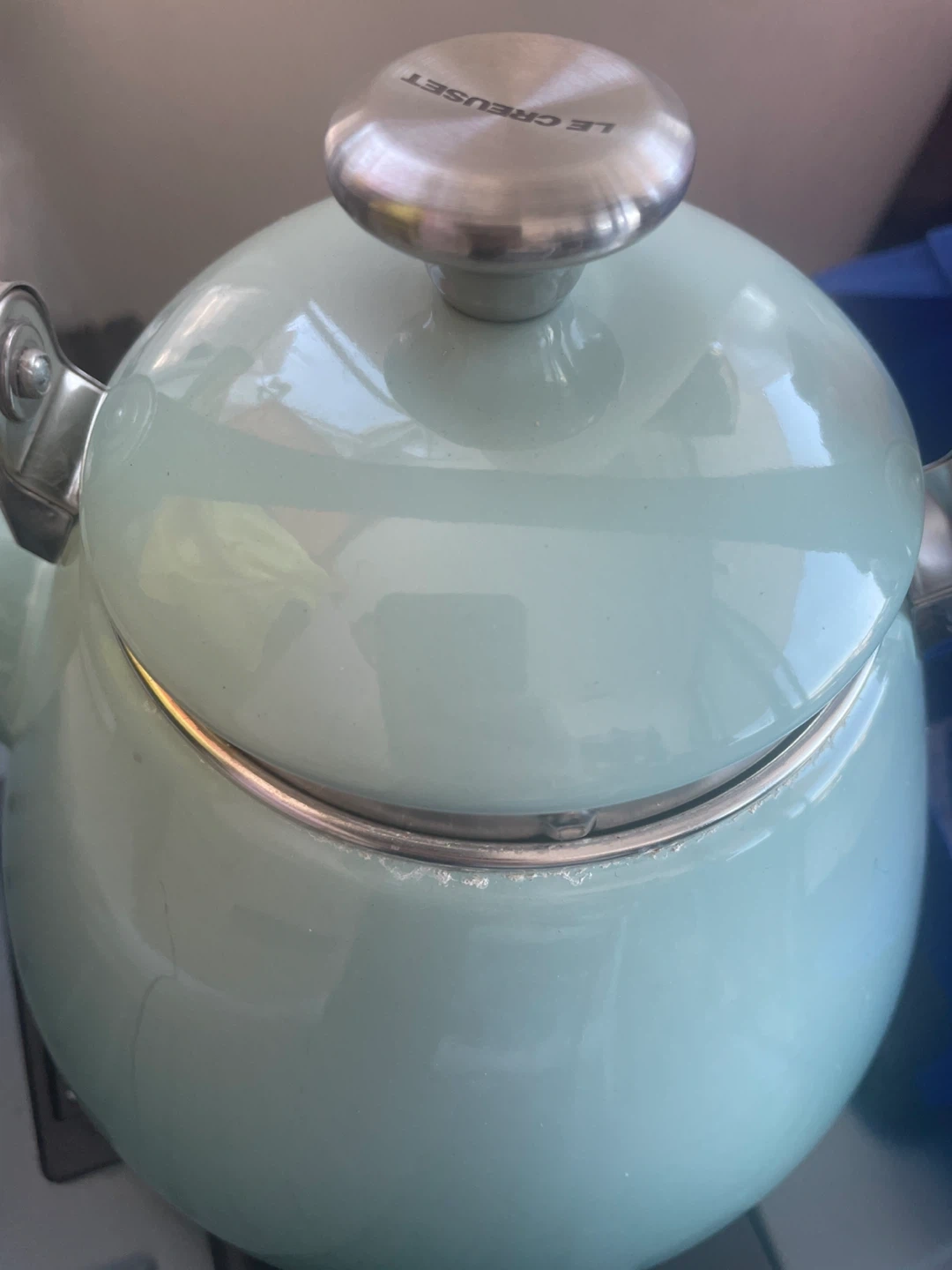This is a Le Creuset Sage Kone Kettle with a 1.6L capacity. It's a lovely mint green colour. The kettle is made from durable enamel-coated steel. Perfect for making a warm brew on a chilly morning!