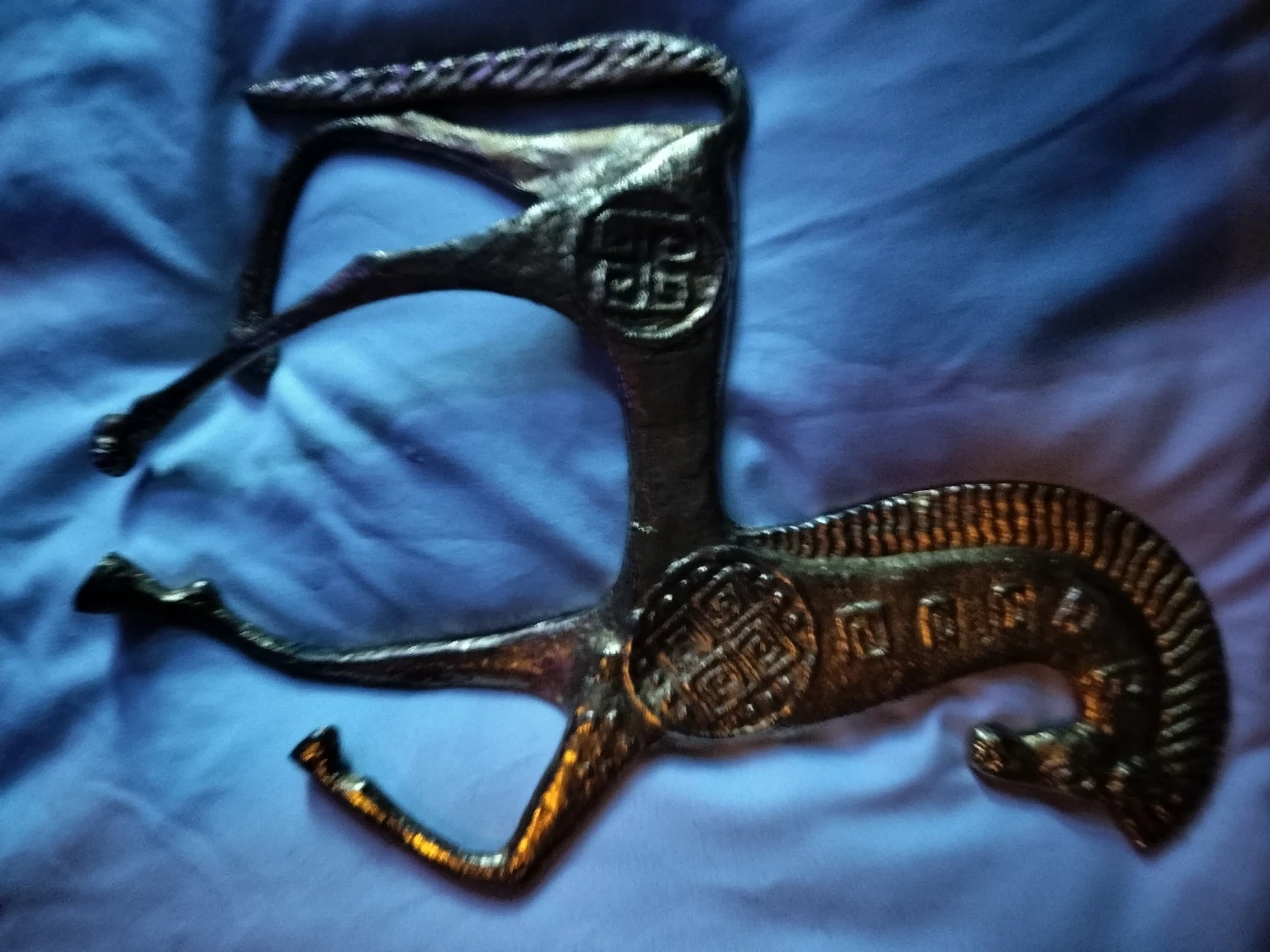 It features incised, abstracted designs on its body and neck.