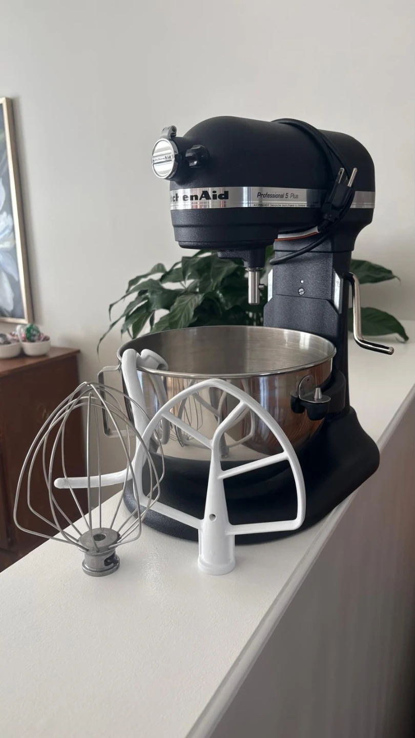 This is a black KitchenAid Professional 5 Plus stand mixer. It comes with a stainless steel bowl and three attachments: a wire whisk, a flat beater, and a dough hook.