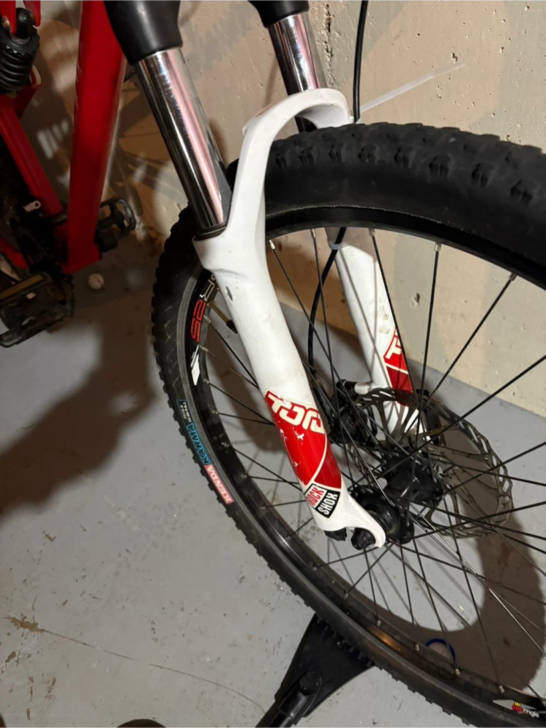 This is a red full suspension mountain bike. It has a Shimano drivetrain and RockShox front forks. It has hydraulic disc brakes, front and rear.