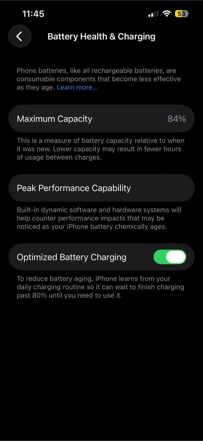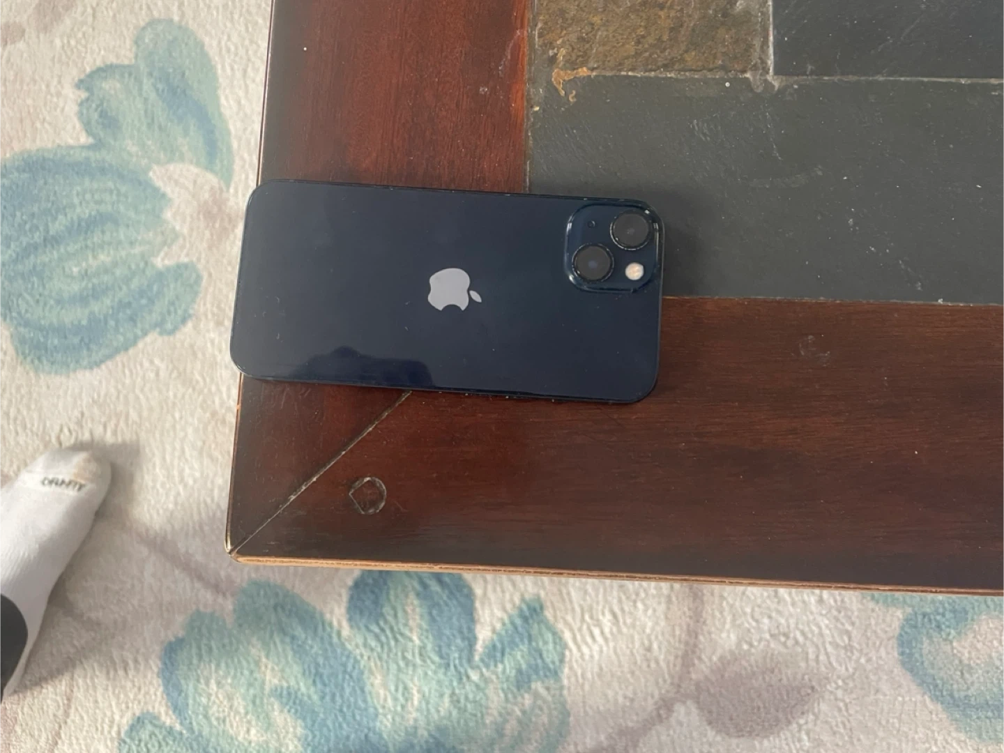 This is an Apple iPhone 13 with 128GB of storage. It comes in a dark blue colour. The battery's maximum capacity is 84%.