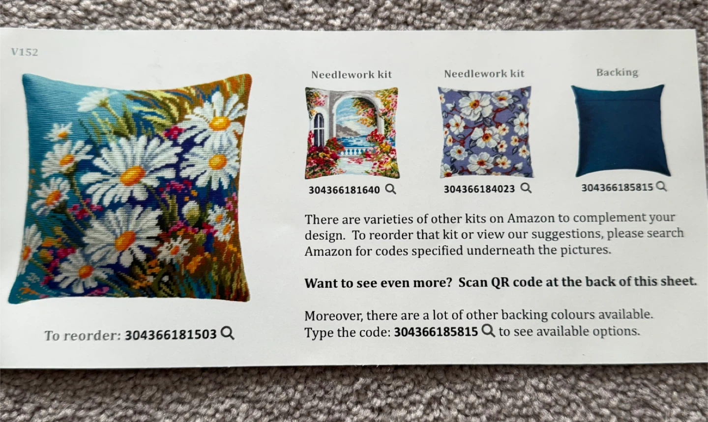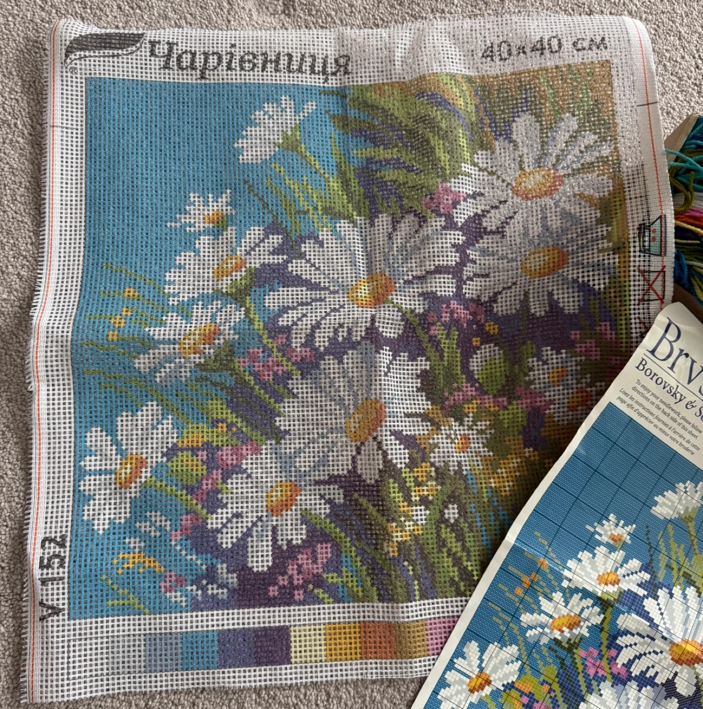 This is a Brvsk "Meadow of Daisies" V-152 printed tapestry kit for a DIY pillow case. It includes acrylic yarn and printed tapestry canvas. The canvas size is 18" x 20" (46 cm x 50 cm), with a finished size of 16" x 16" (40 cm x 40 cm). This kit is perfect for crafters who enjoy needlepoint projects!