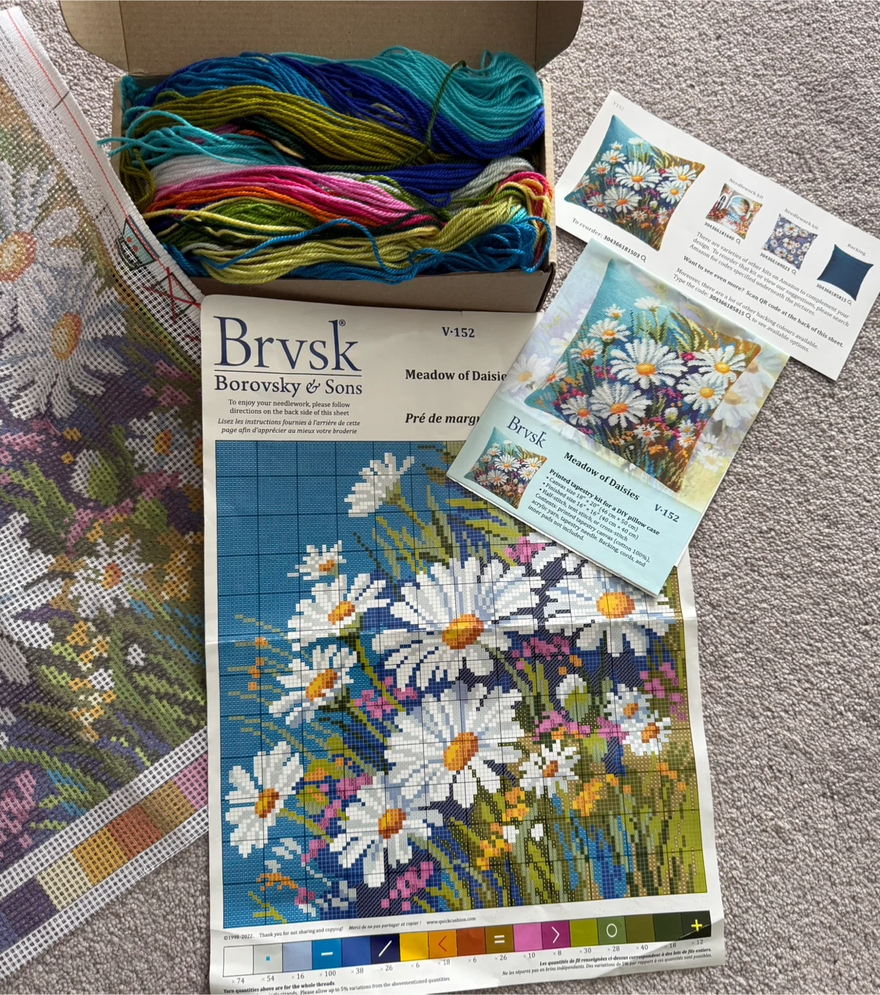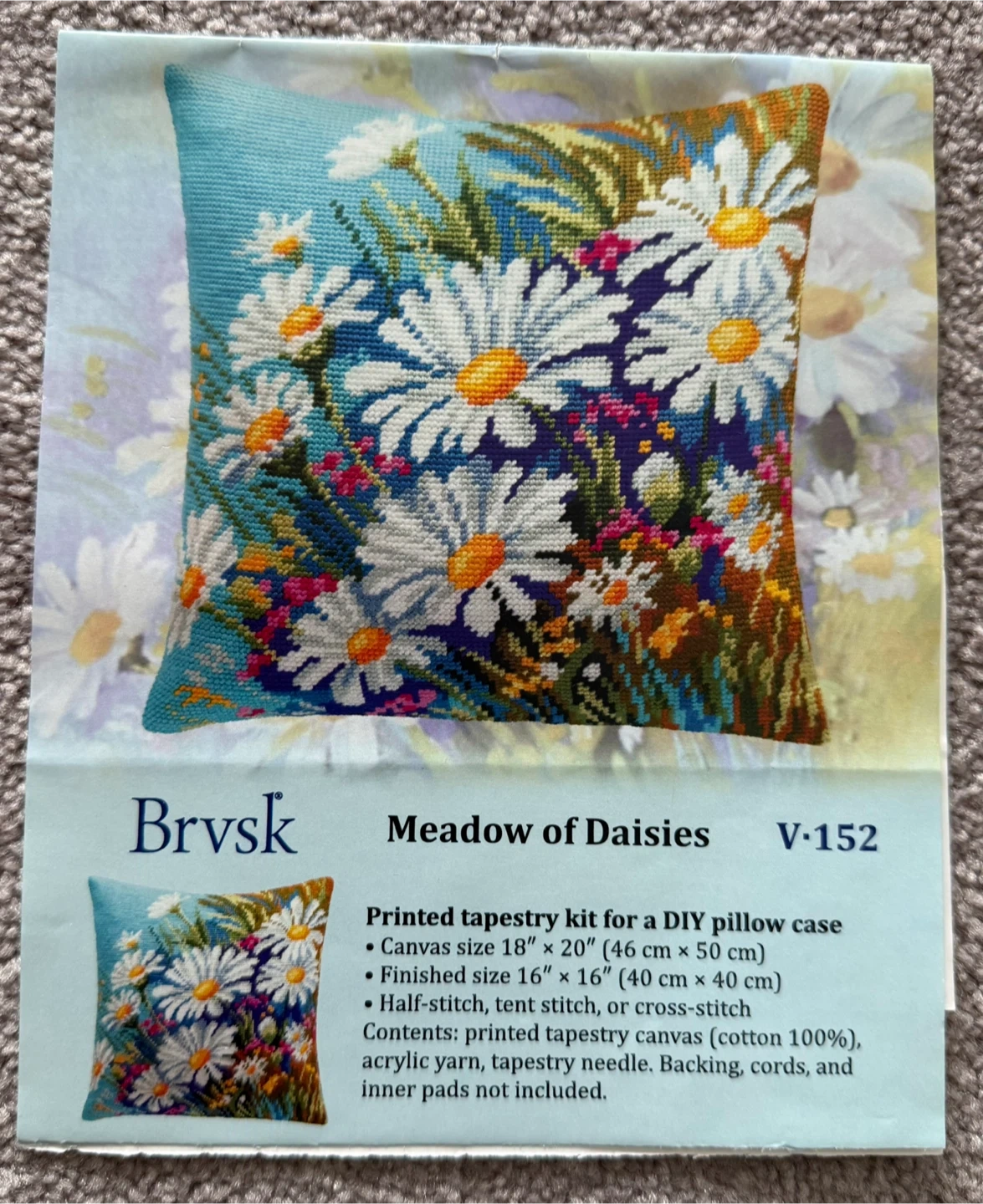 This is a Brvsk "Meadow of Daisies" V-152 printed tapestry kit for a DIY pillow case. It includes acrylic yarn and printed tapestry canvas. The canvas size is 18" x 20" (46 cm x 50 cm), with a finished size of 16" x 16" (40 cm x 40 cm). This kit is perfect for crafters who enjoy needlepoint projects!