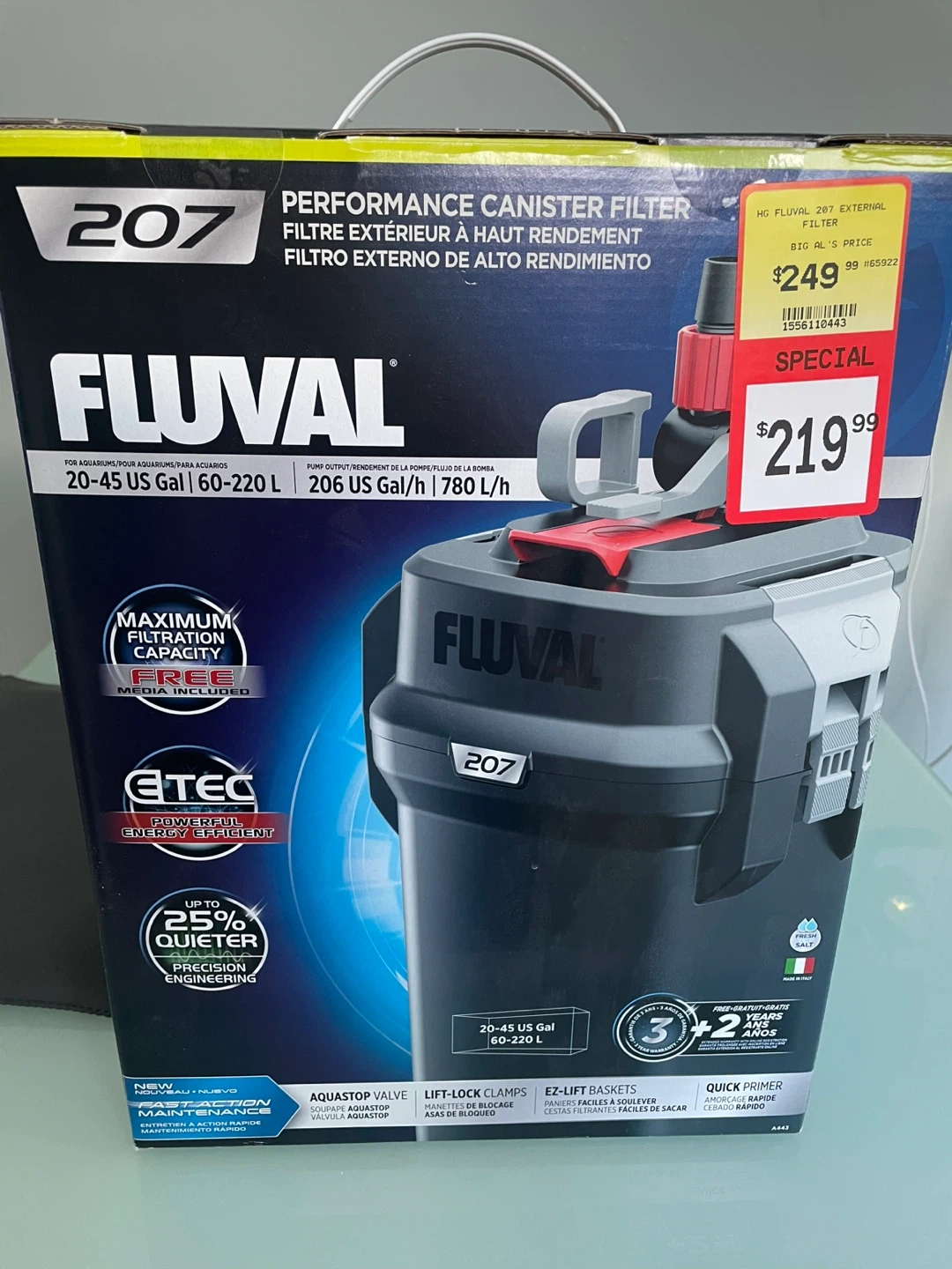 This is a Fluval 207 external canister filter for aquariums. It's designed for 20-45 US gallon tanks and has a pump output of 206 US gallons per hour. The filter features a powerful and energy-efficient eTEC technology, and is up to 25% quieter with precision engineering.