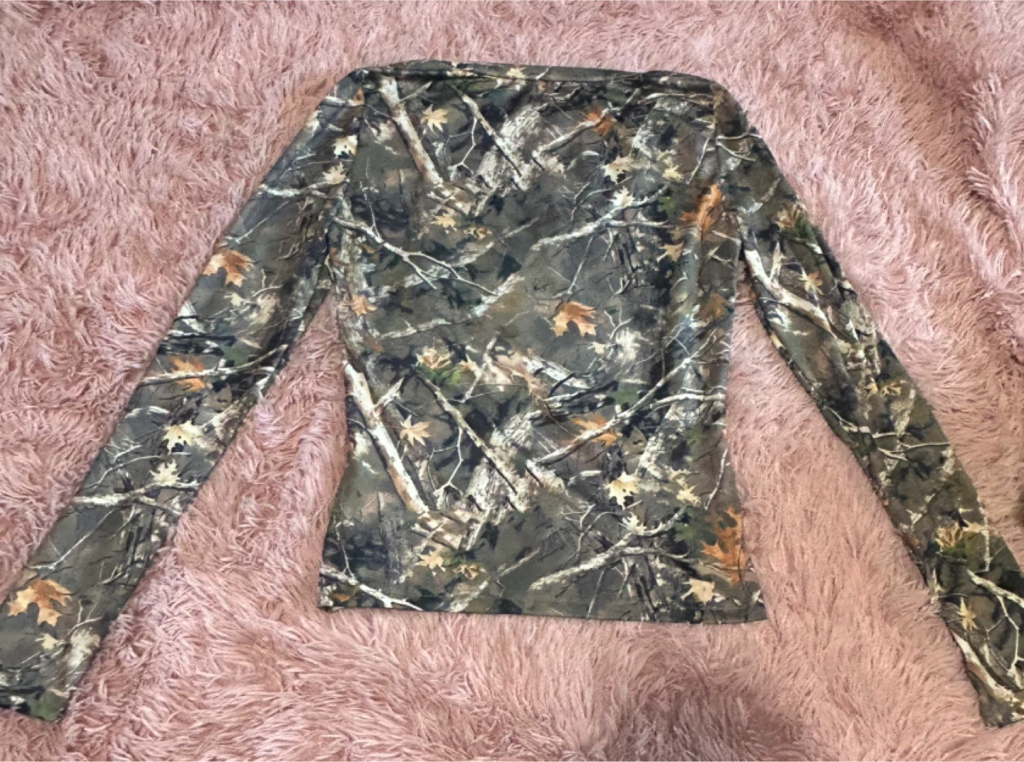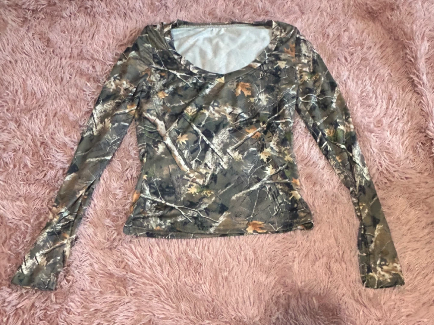 This long-sleeved t-shirt features a realistic camouflage pattern. It's made from a comfortable, stretchy material.