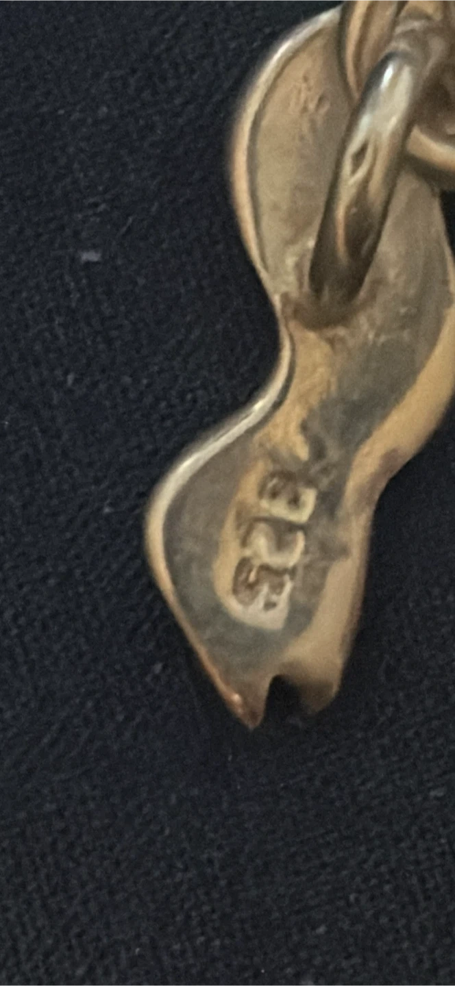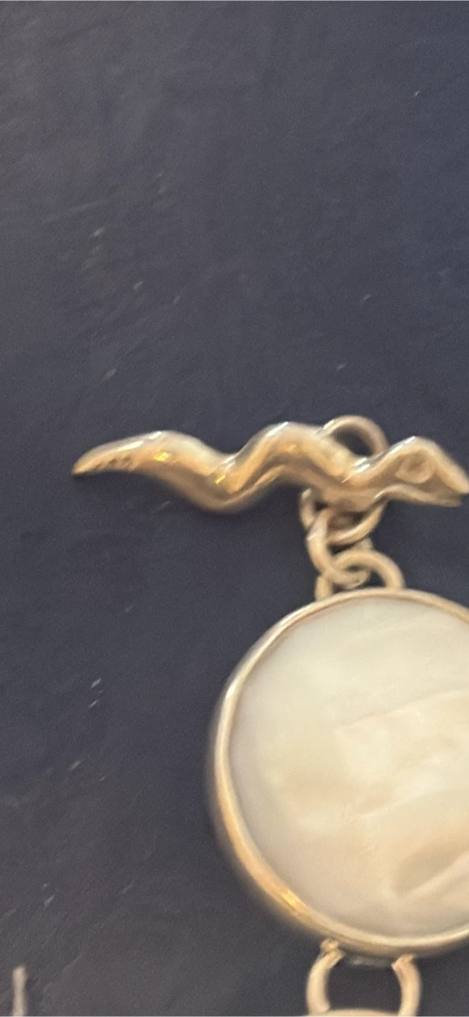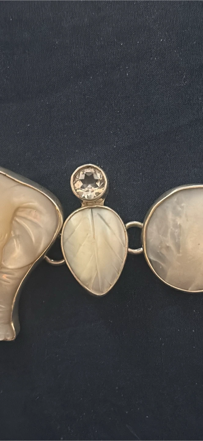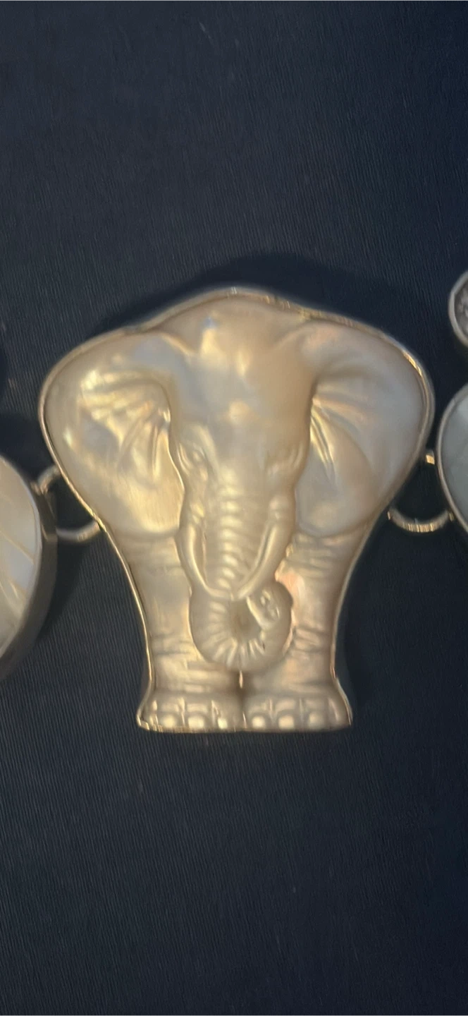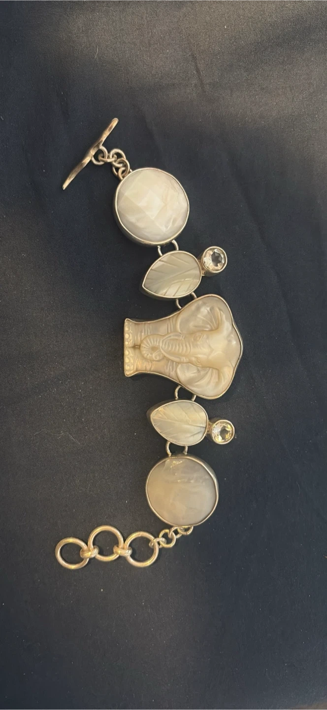 Sterling silver bracelet with a carved mother of pearl elephant. It features mother of pearl cabochons and clear stones. Bracelet measures approximately 7 inches in length.