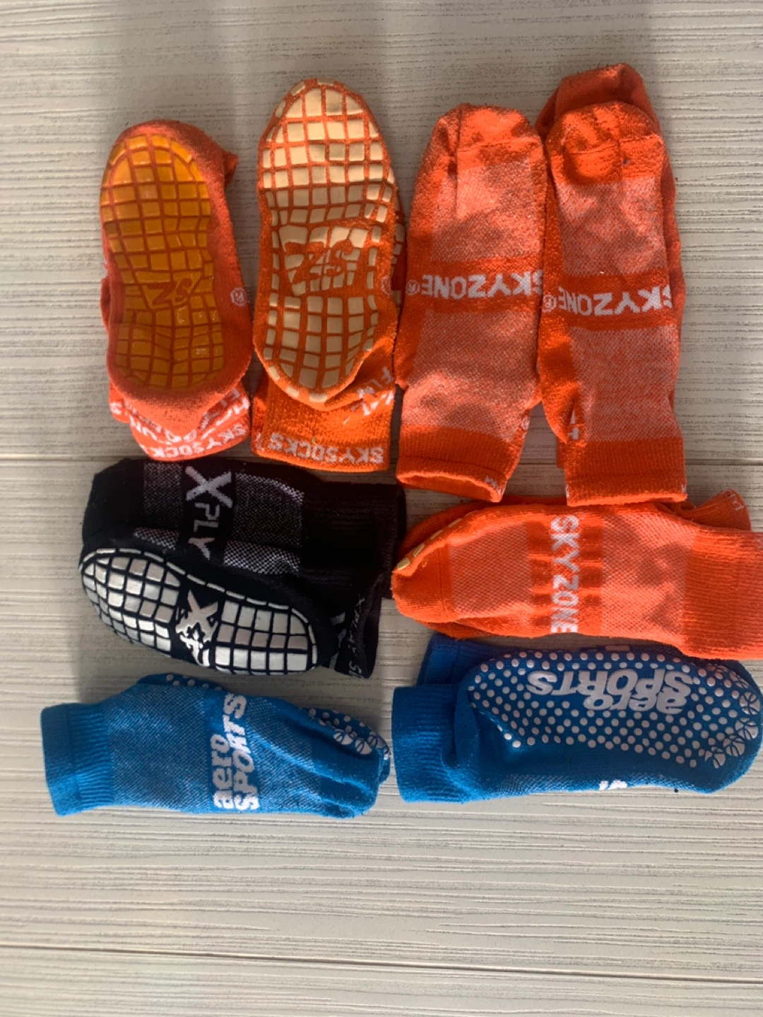 This bundle includes 6 pairs of grip socks in various colours and brands. 5 pairs are orange Sky Zone socks, one black pair with Pzazz grip, one blue pair with Aero Sports branding and grip. They're designed for added traction.