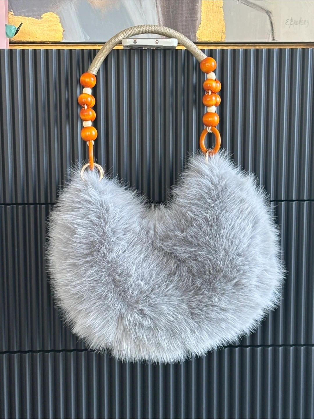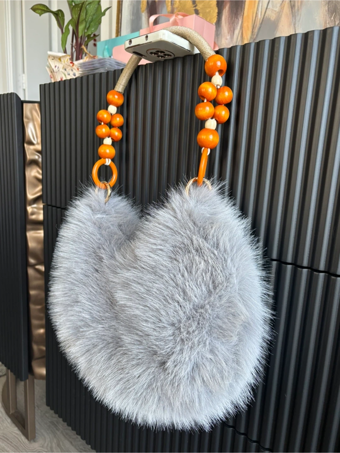 This fluffy grey handbag features a unique handle adorned with orange and wood-tone beads. It's a stylish accessory for adding a pop of fun to your outfit. The faux fur material makes it soft and eye-catching.