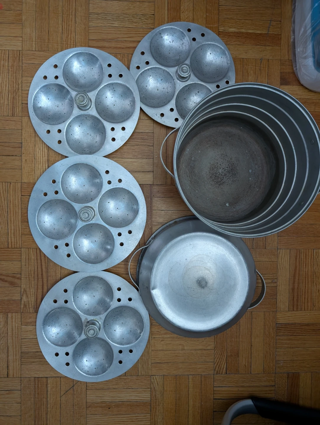 This set includes an aluminium idli maker with multiple plates and a steamer pot. It's made of durable aluminum and designed for making idlis. These pans are great for cooking south Indian breakfast items.