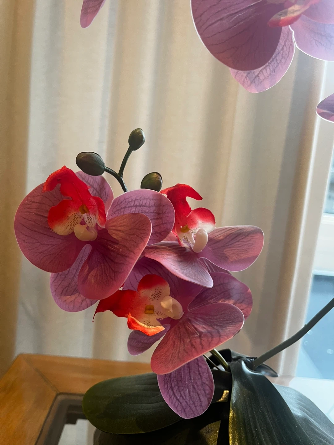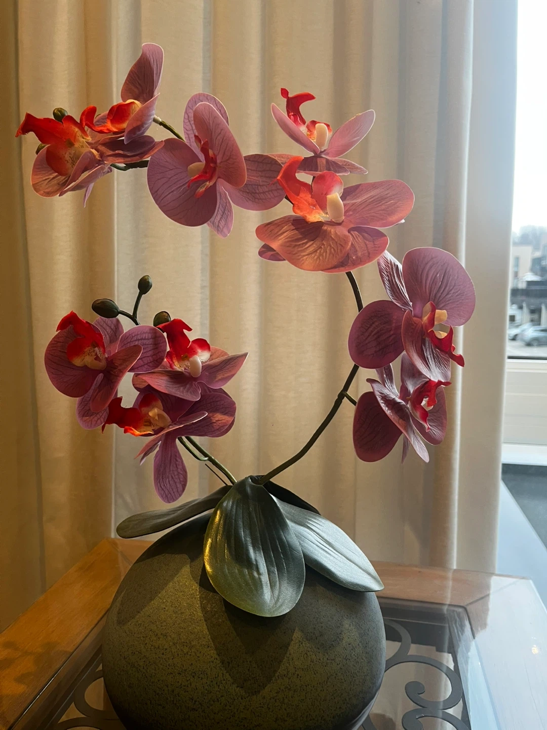 This artificial orchid arrangement features delicate purple and red blooms in a textured green vase. It's a lovely decorative piece for any home. The vase is ceramic.