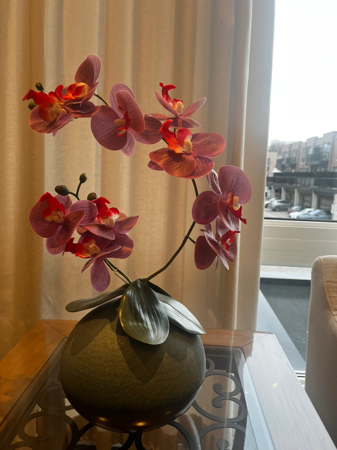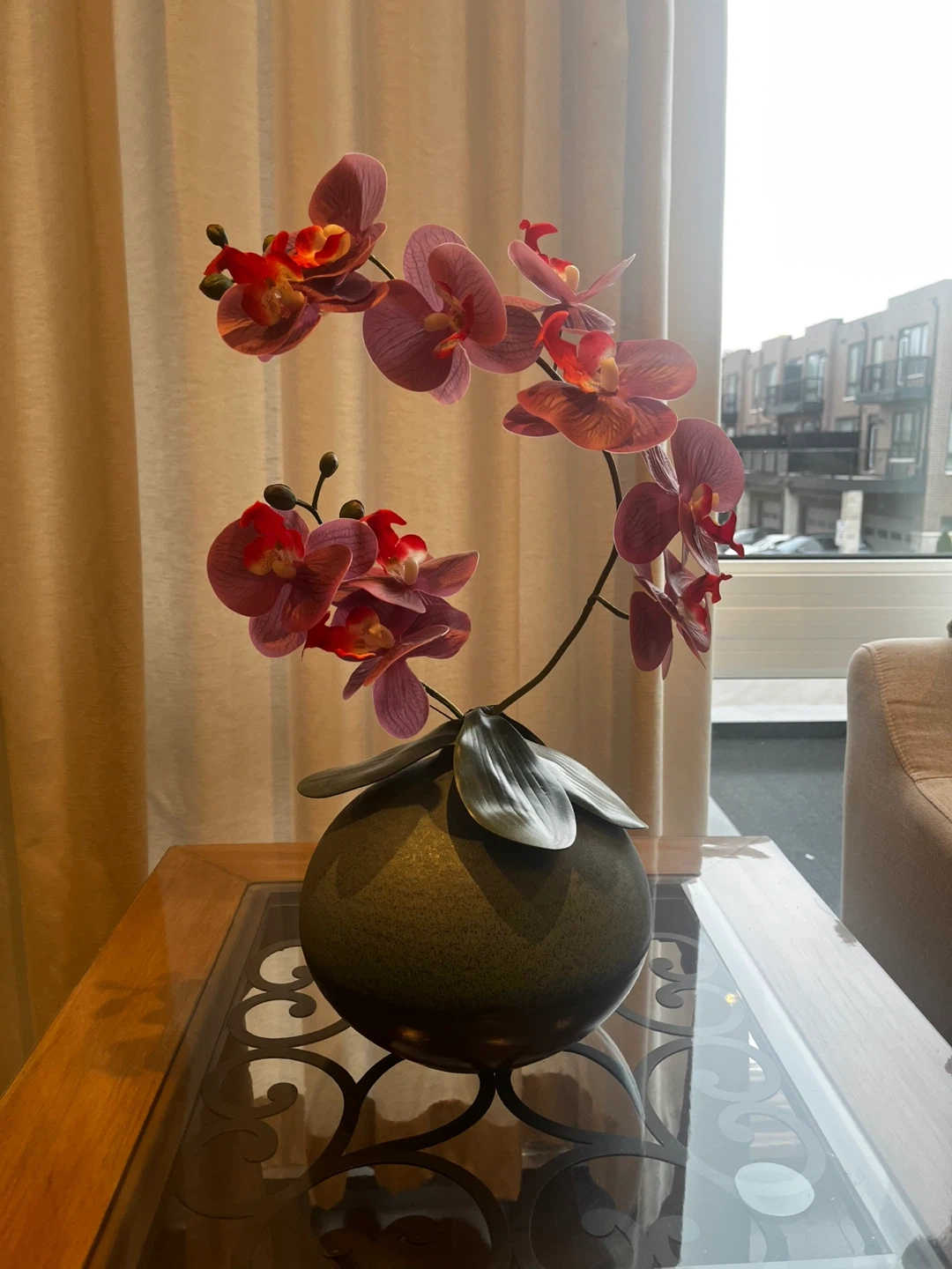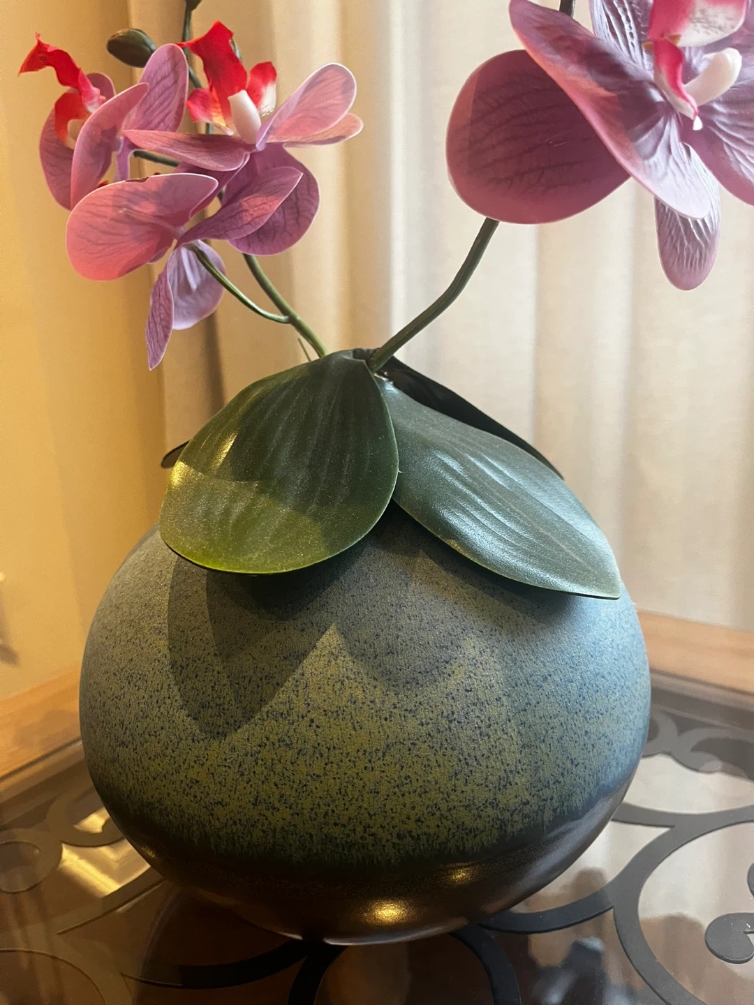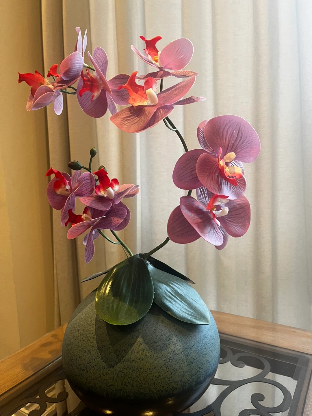This artificial orchid arrangement features delicate purple and red blooms in a textured green vase. It's a lovely decorative piece for any home. The vase is ceramic.