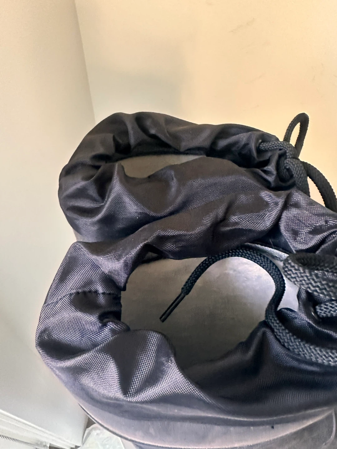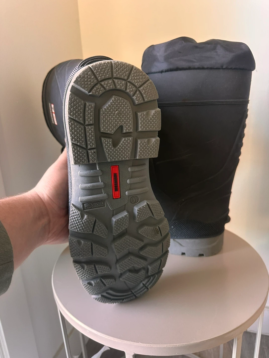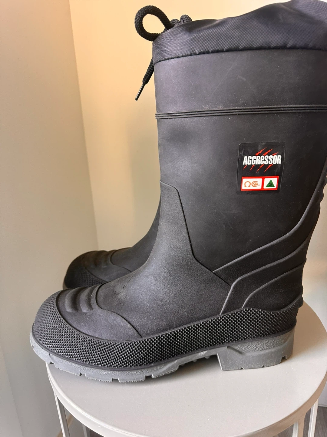 These are black Aggressor work boots. They're size 10 and made from rubber. The soles have good tread for traction. These boots are designed for protection and durability.