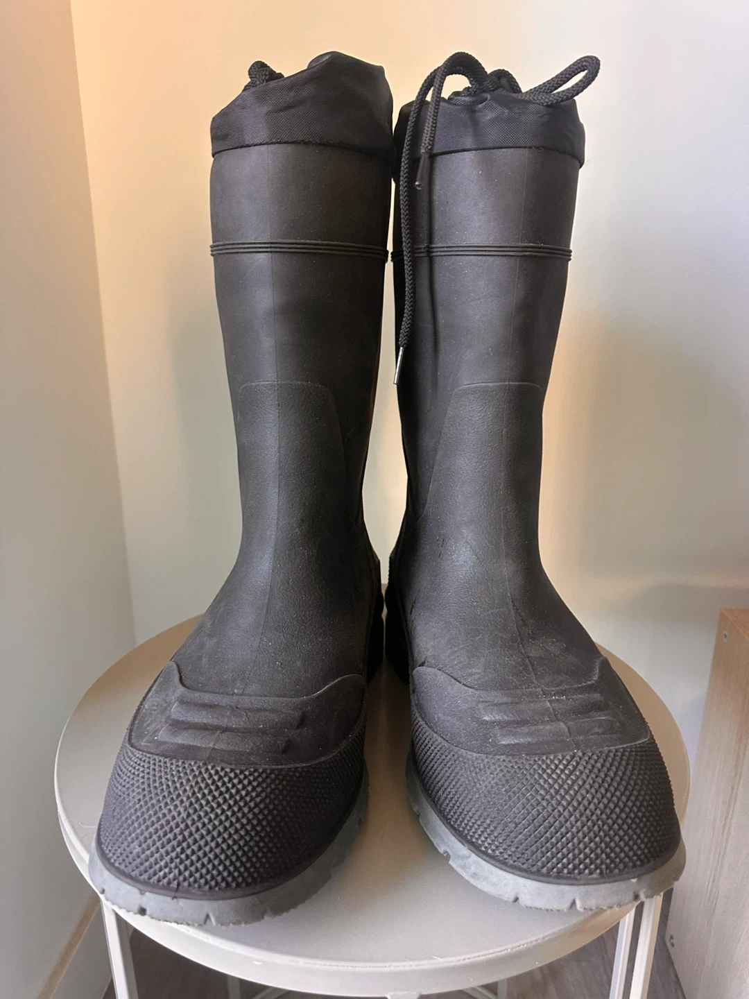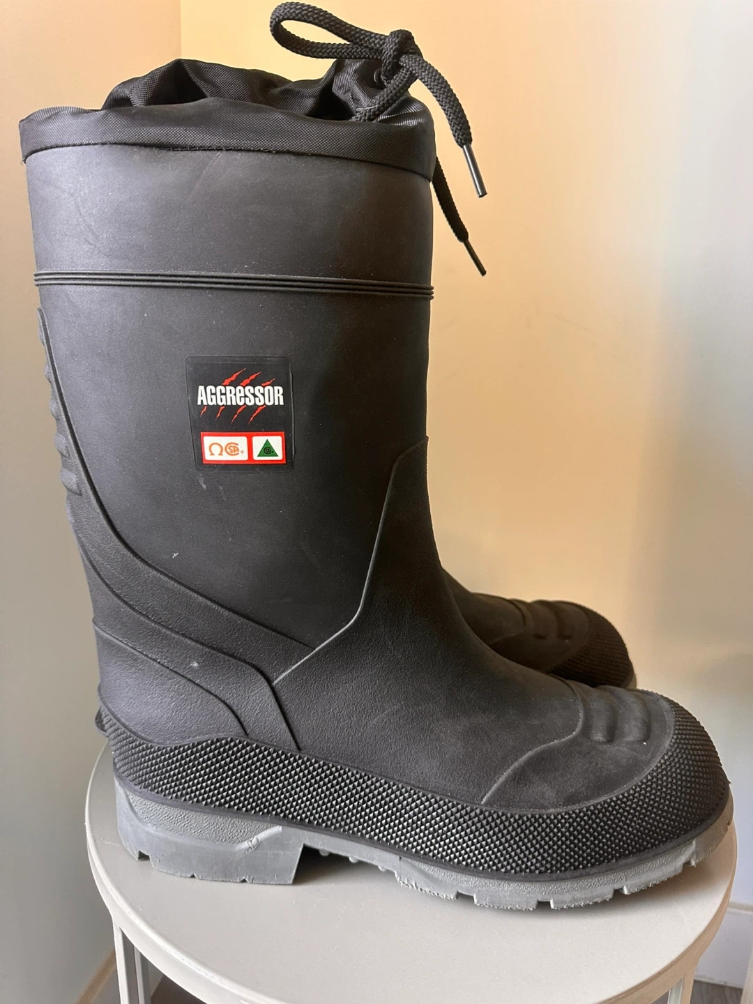 These are black Aggressor work boots. They're size 10 and made from rubber. The soles have good tread for traction. These boots are designed for protection and durability.