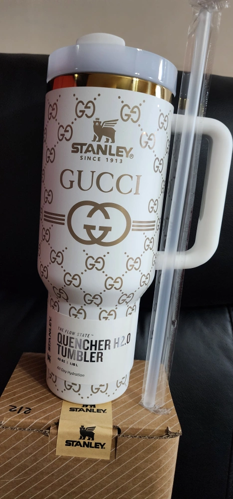 brand new in original stanley box This 40 oz Stanley Quencher H2.0 tumbler features a stylish white and gold Gucci it's designed for all-day hydration and comes with a reusable straw and handle. The tumbler is made of durable stainless steel.