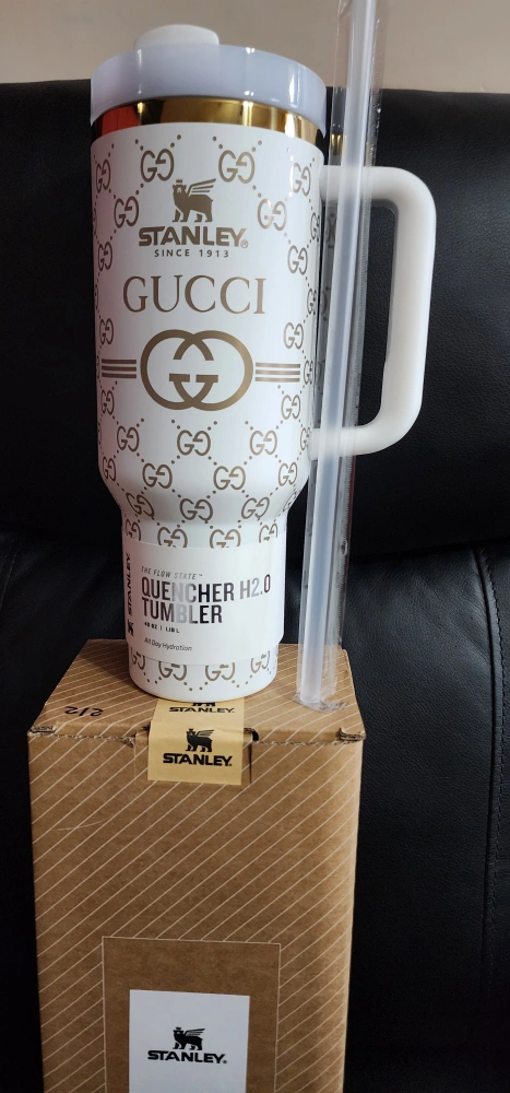 brand new in original stanley box This 40 oz Stanley Quencher H2.0 tumbler features a stylish white and gold Gucci it's designed for all-day hydration and comes with a reusable straw and handle. The tumbler is made of durable stainless steel.